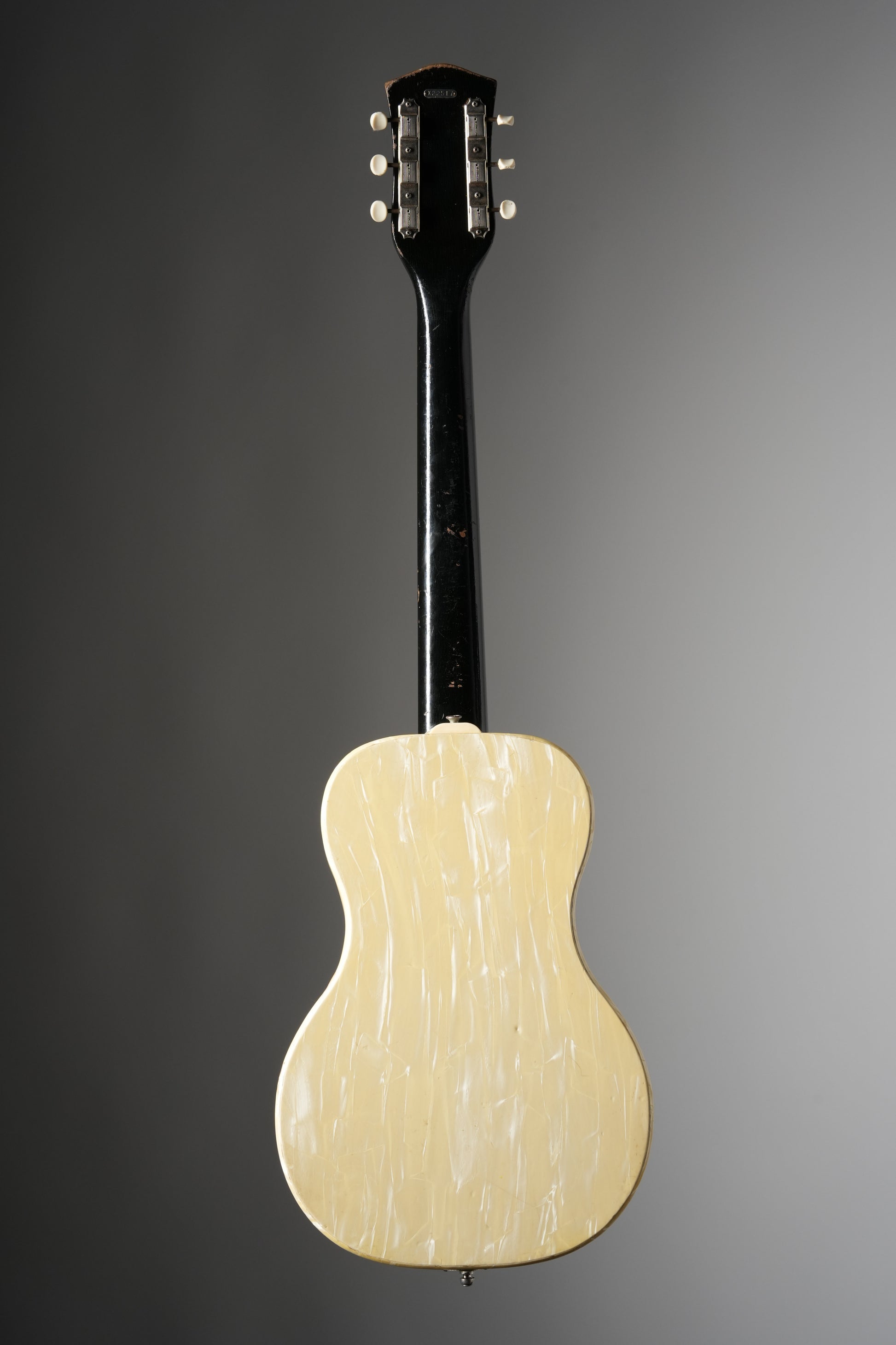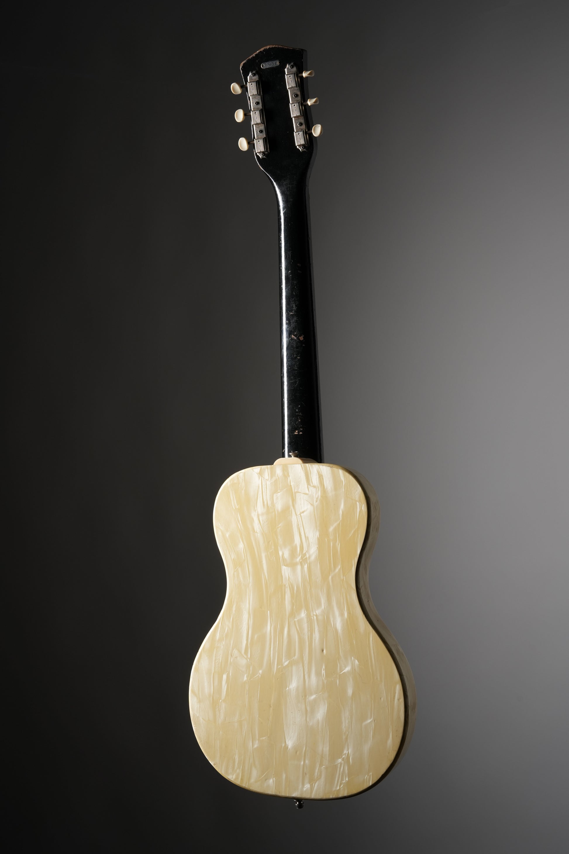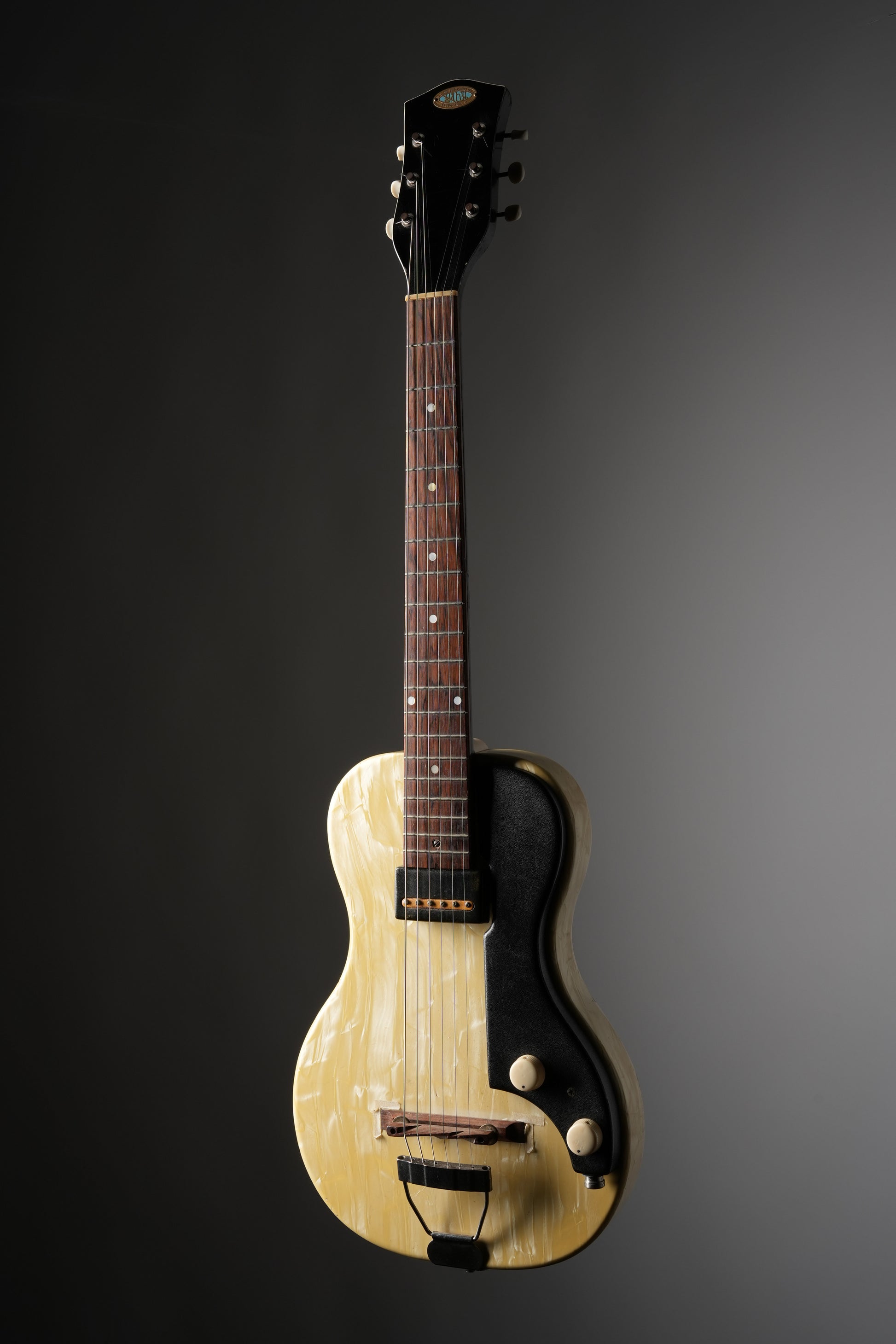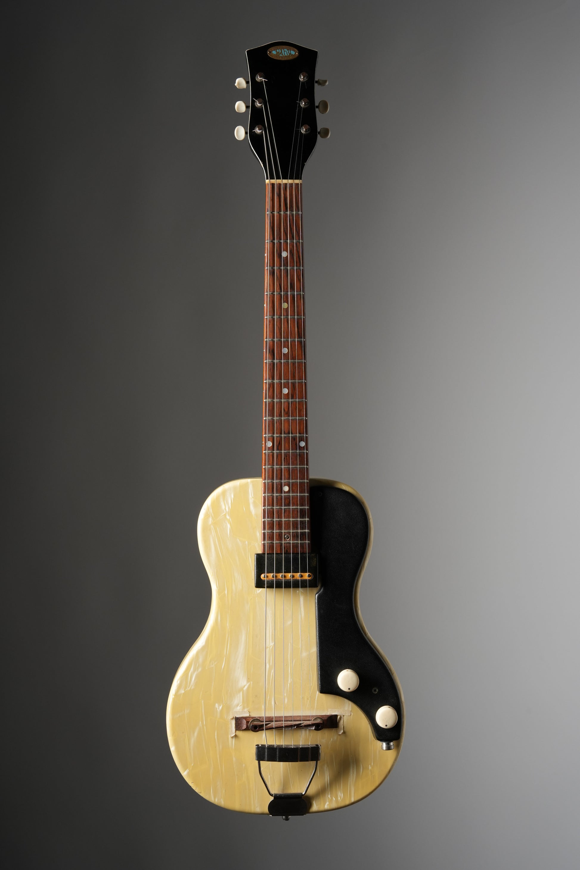 - Body: The 1952-1953 Oahu Ozark Electric Guitar boasts a unique White Pearloid finish, now aged to a beautiful ivory hue after nearly 70 years. Its original Brazilian Rosewood bridge with brass adjustment wheels allows for a customizable, high-quality sound. Its vintage charm is evident in its slight pull-away at the waist, common for instruments of this age and finish.