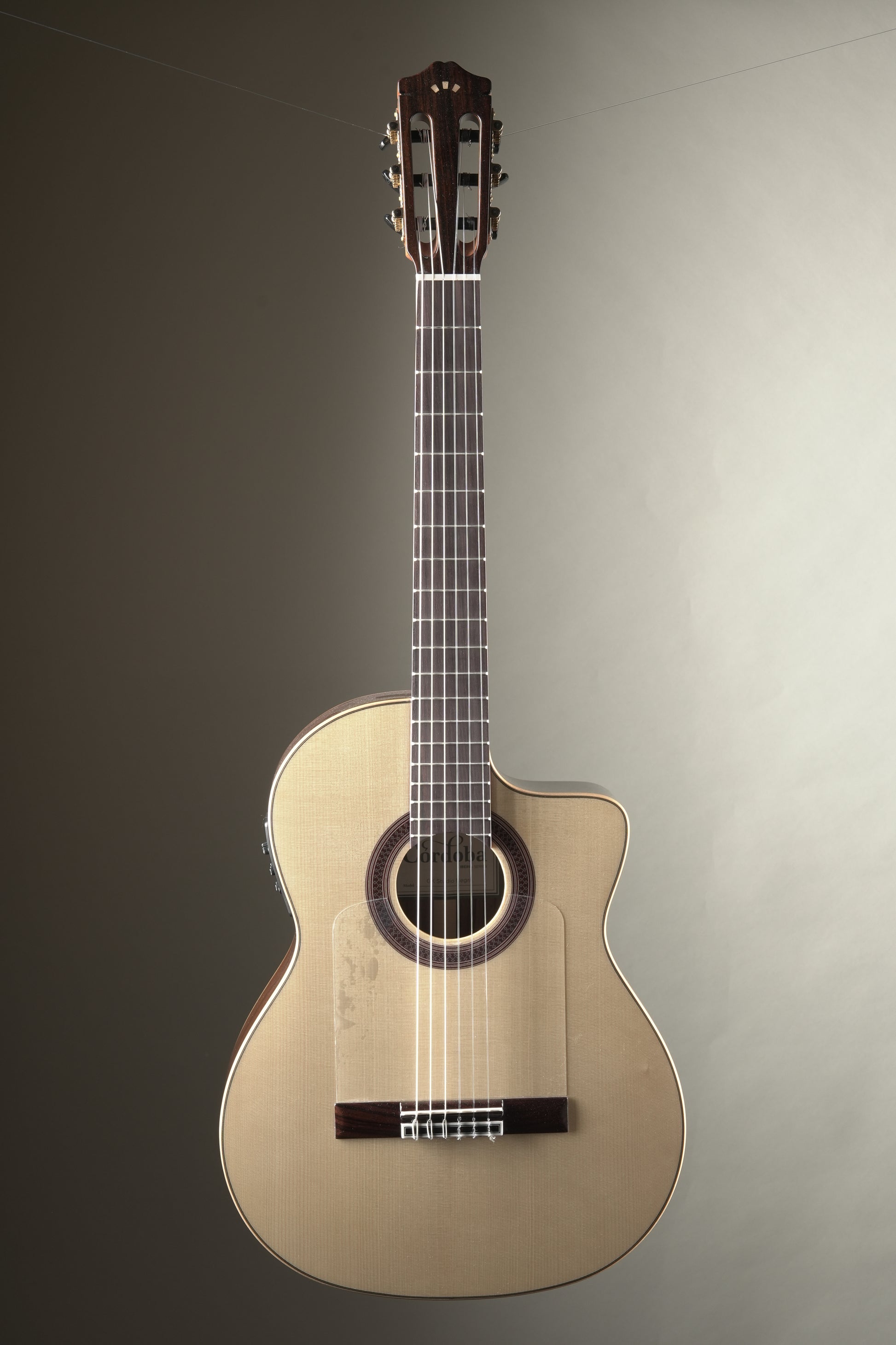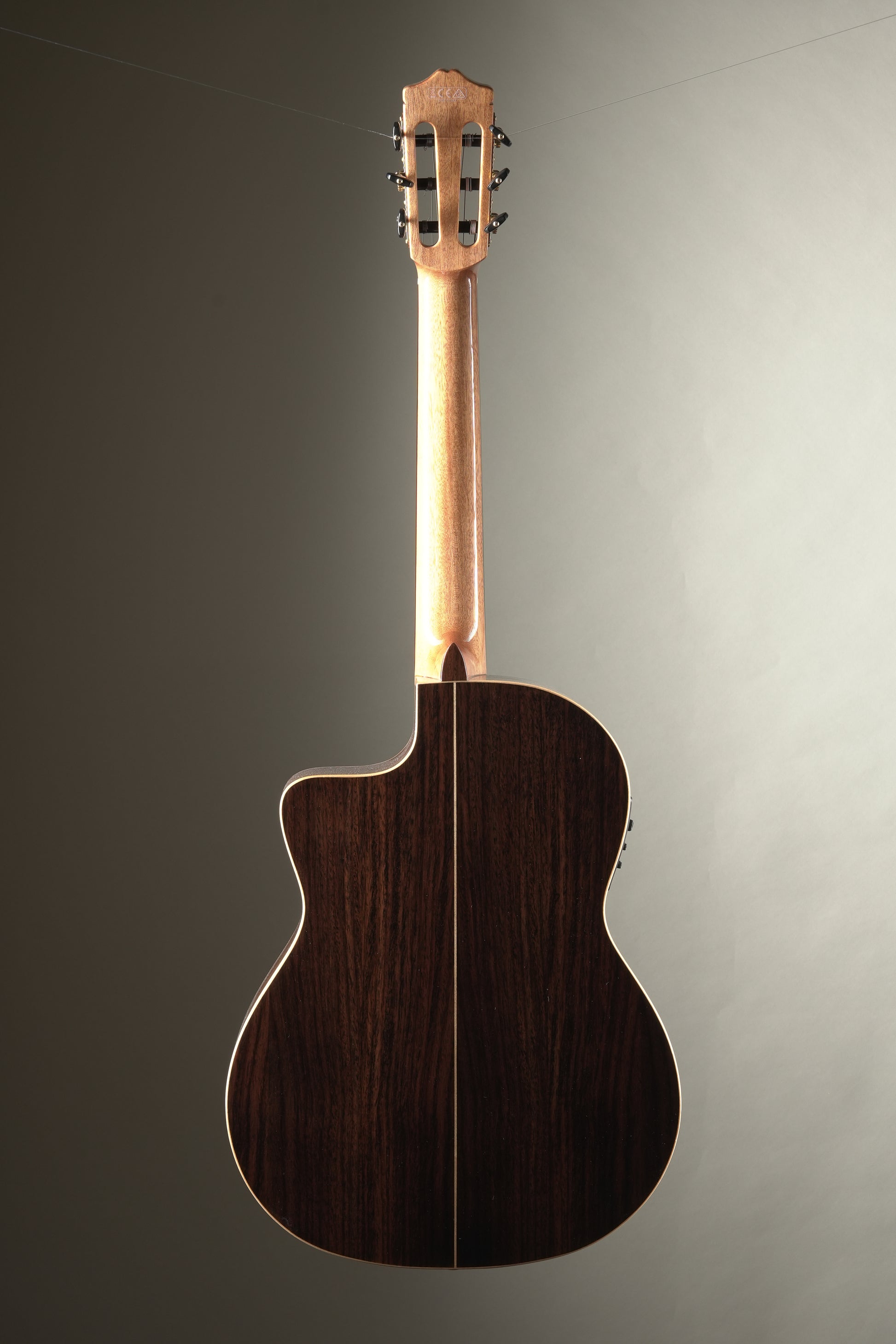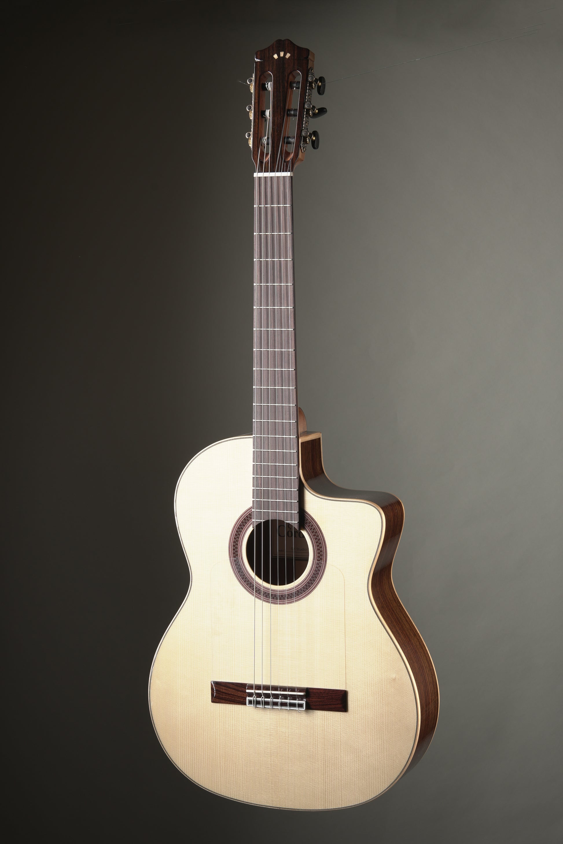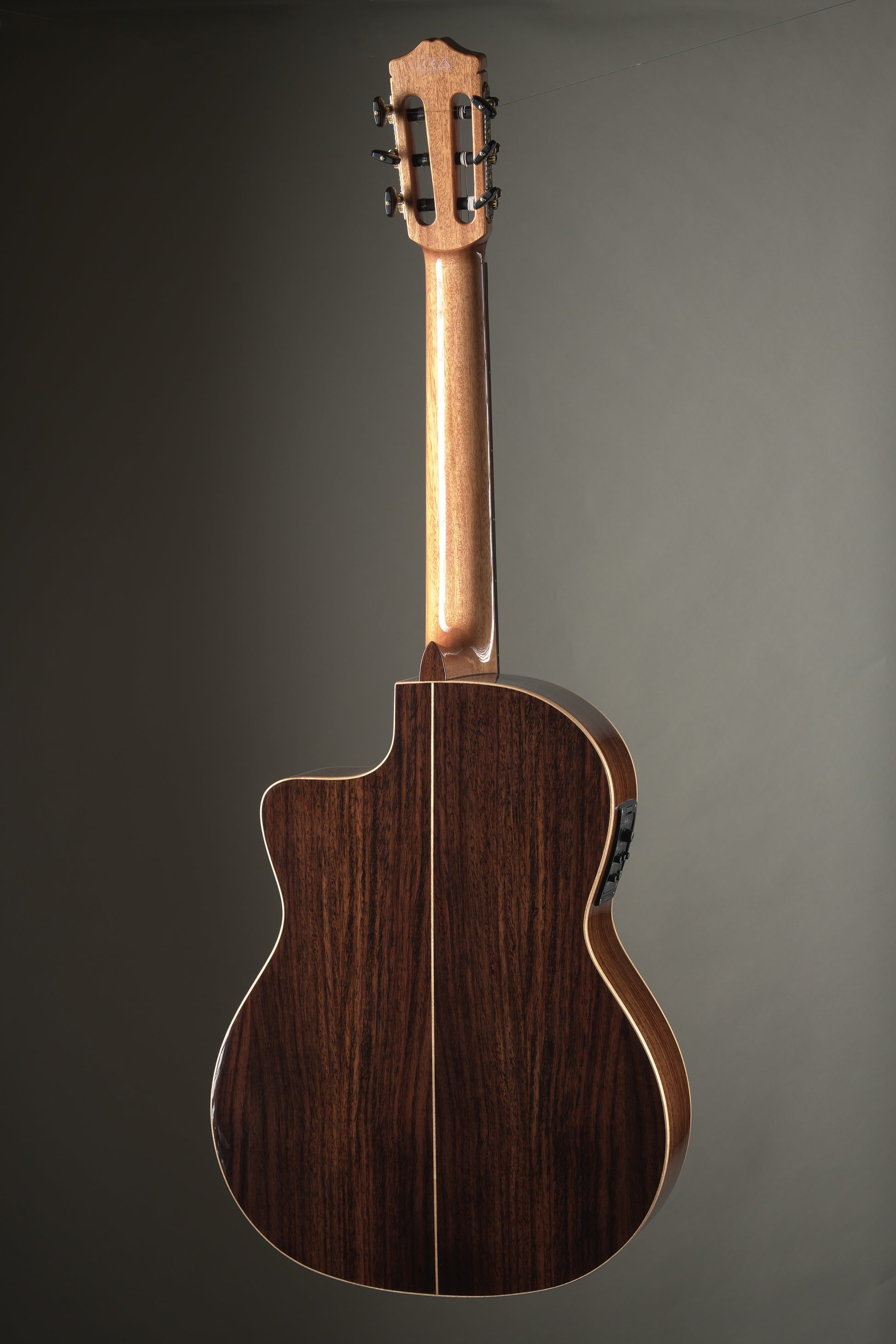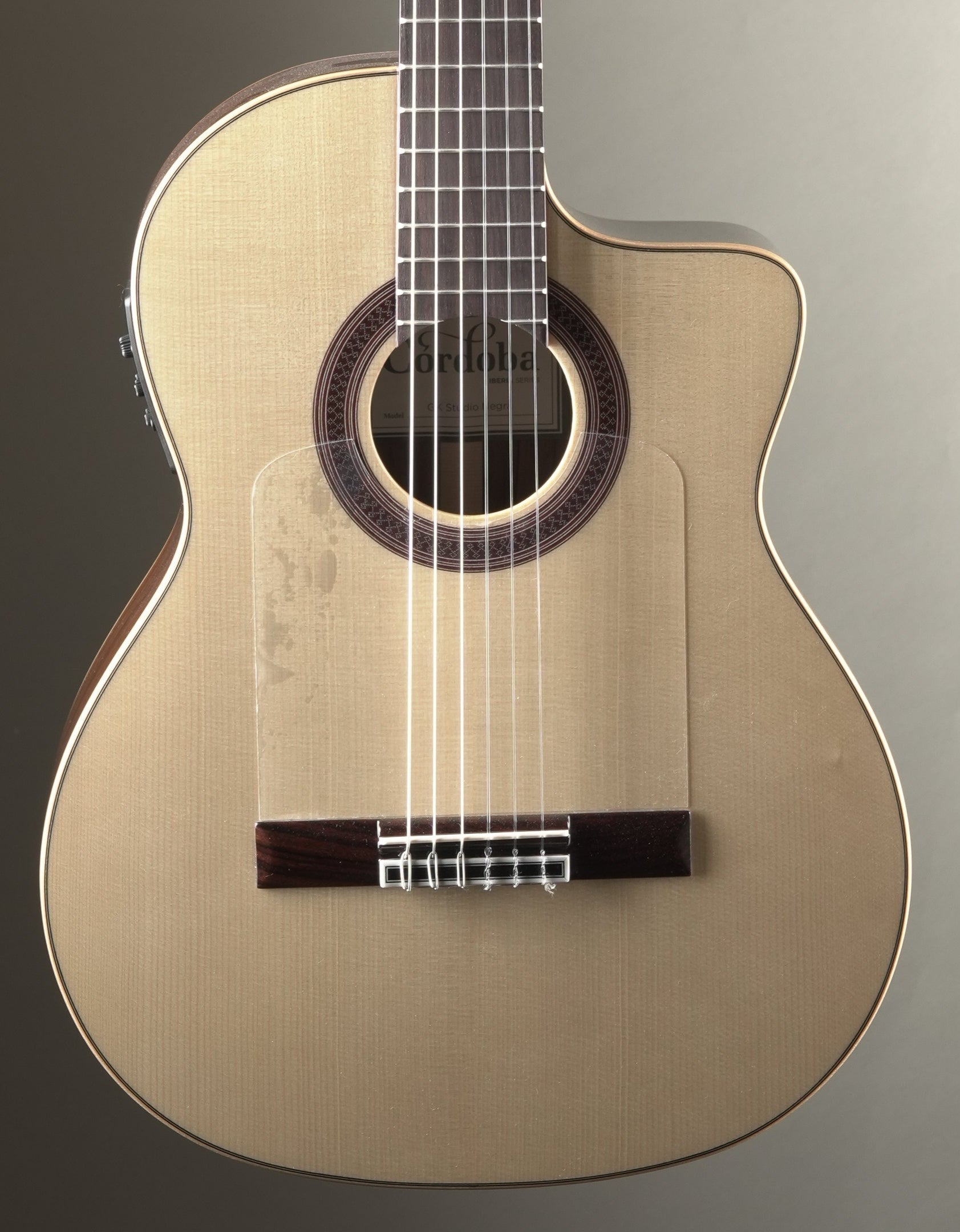 Built with a solid European Spruce top, Rosewood back and sides, soft cutaway and Fishman Presys Blend preamp, the GK Studio Negra is the ultimate gigging instrument and a Córdoba best seller. Made for the stage, the GK Studio Negra is constructed with a slightly thinner body depth, neck, and nut width than a traditional Spanish guitar. The neck is designed to have little or no relief, offering low action for ease of comfort and quick playability. Flamenco players choose this model for a bassier and more robust tone in contrast to the bright, snappy sound of ‘blanca’ flamenco guitars. However, any guitarist looking for a new tone will feel right at home. Like every Córdoba guitar, this model has a two-way truss rod built into the neck. Other premium features include a high gloss finish, clear flamenco-style tap plate, and Savarez strings.