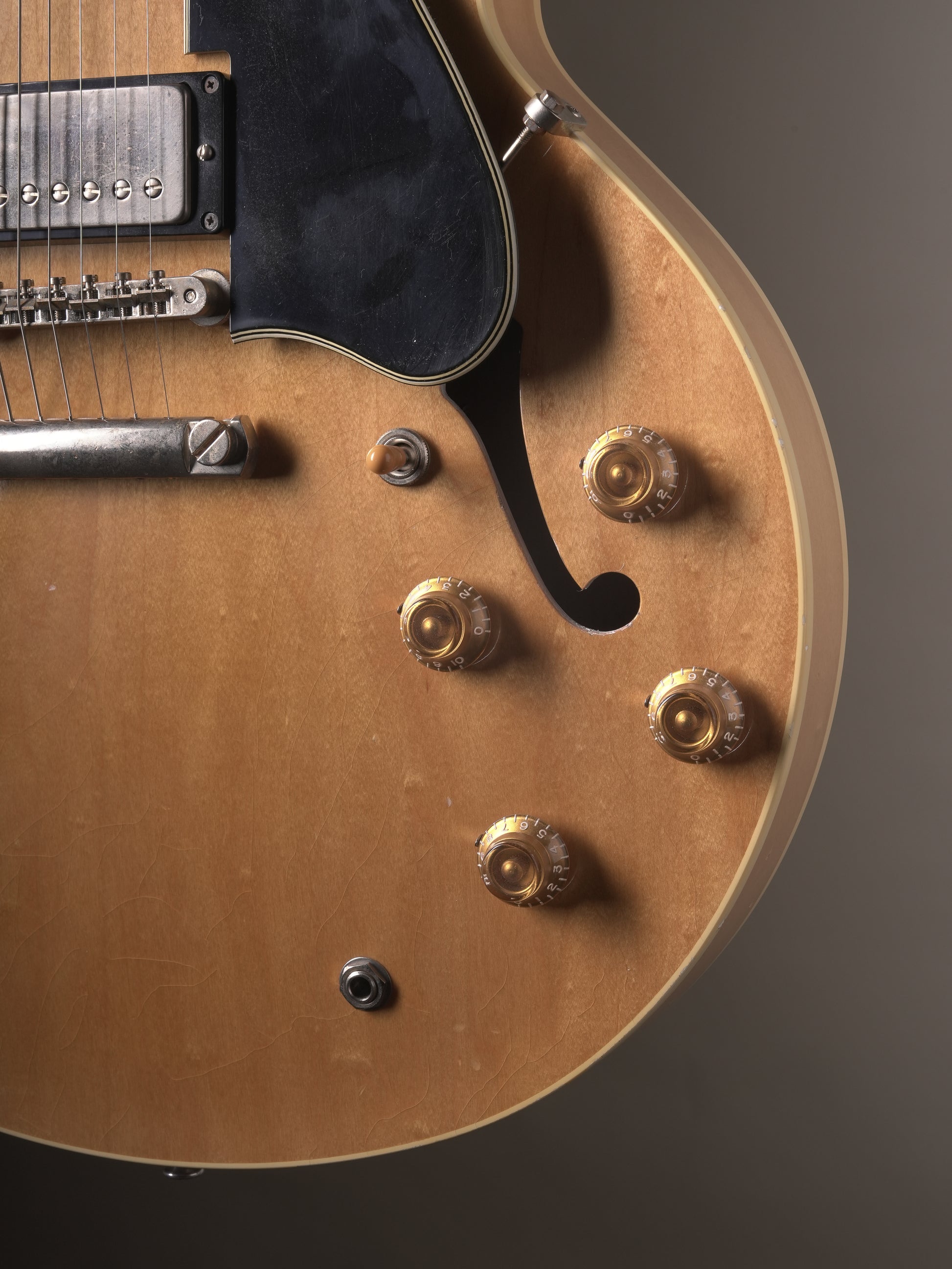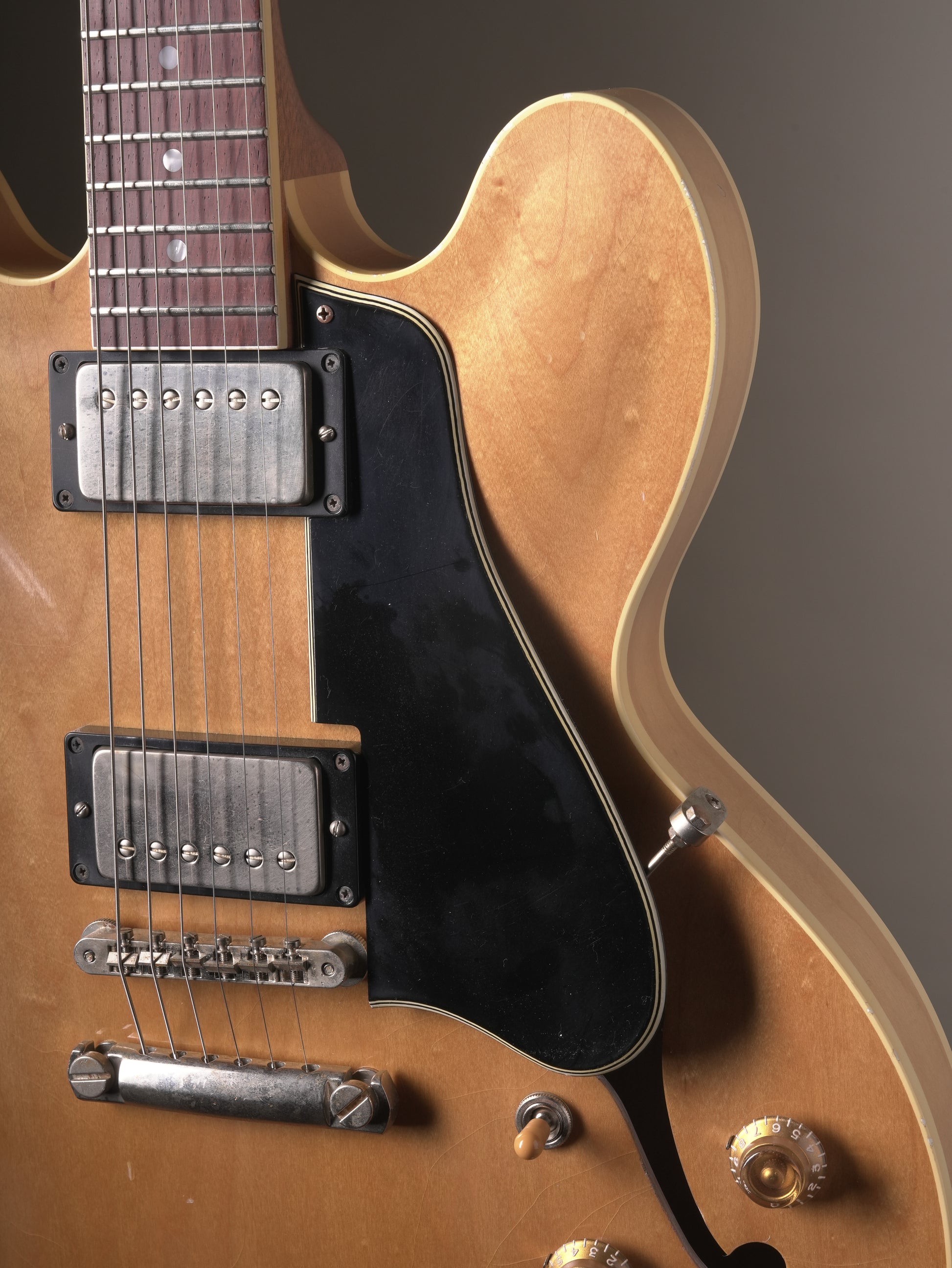 Period-correct hardware includes a brass-saddle ABR-1–type bridge, aluminum tailpiece, long studs, long pickguard, top hat knobs, and other details inspired by late-1950s designs.