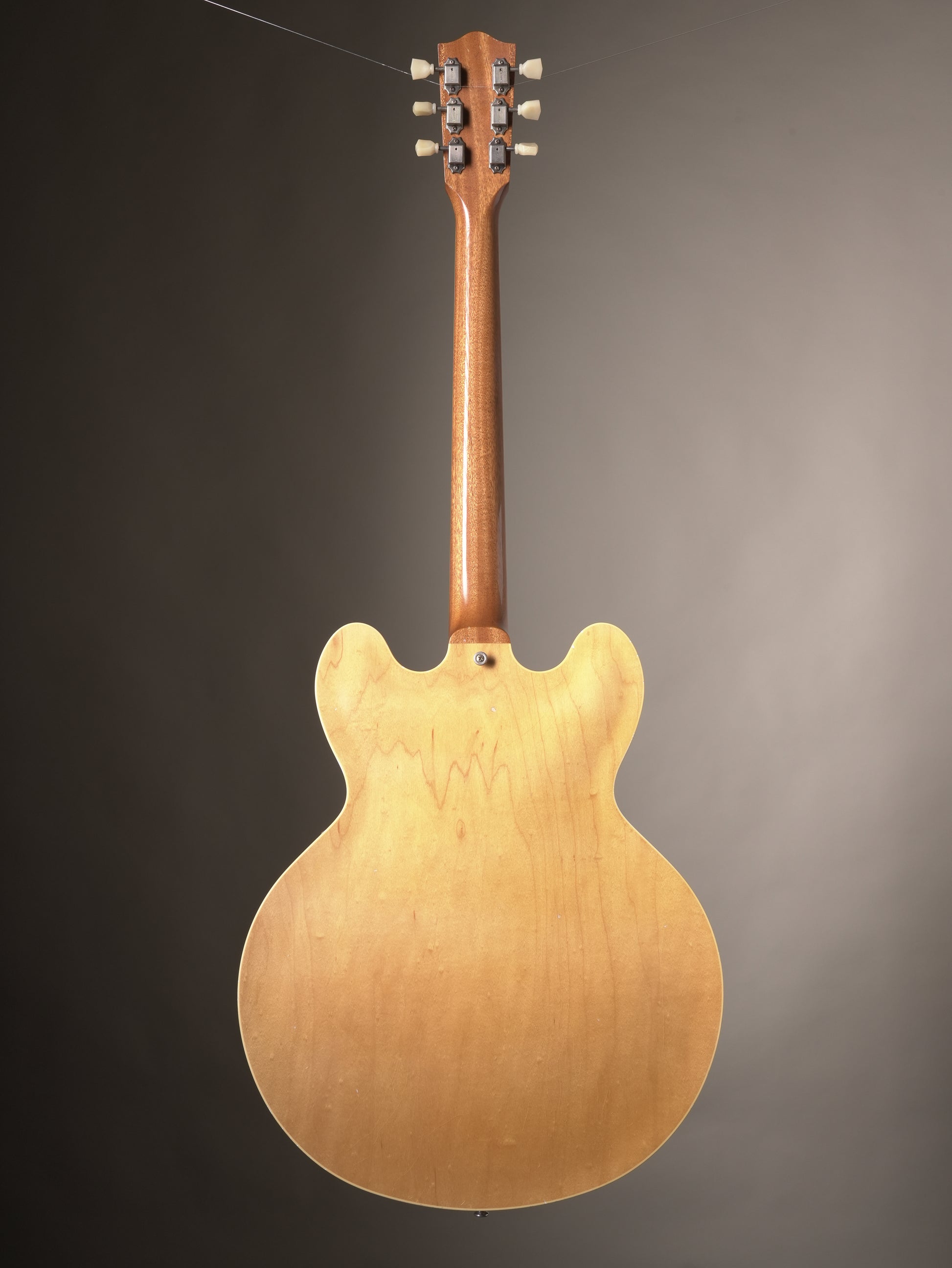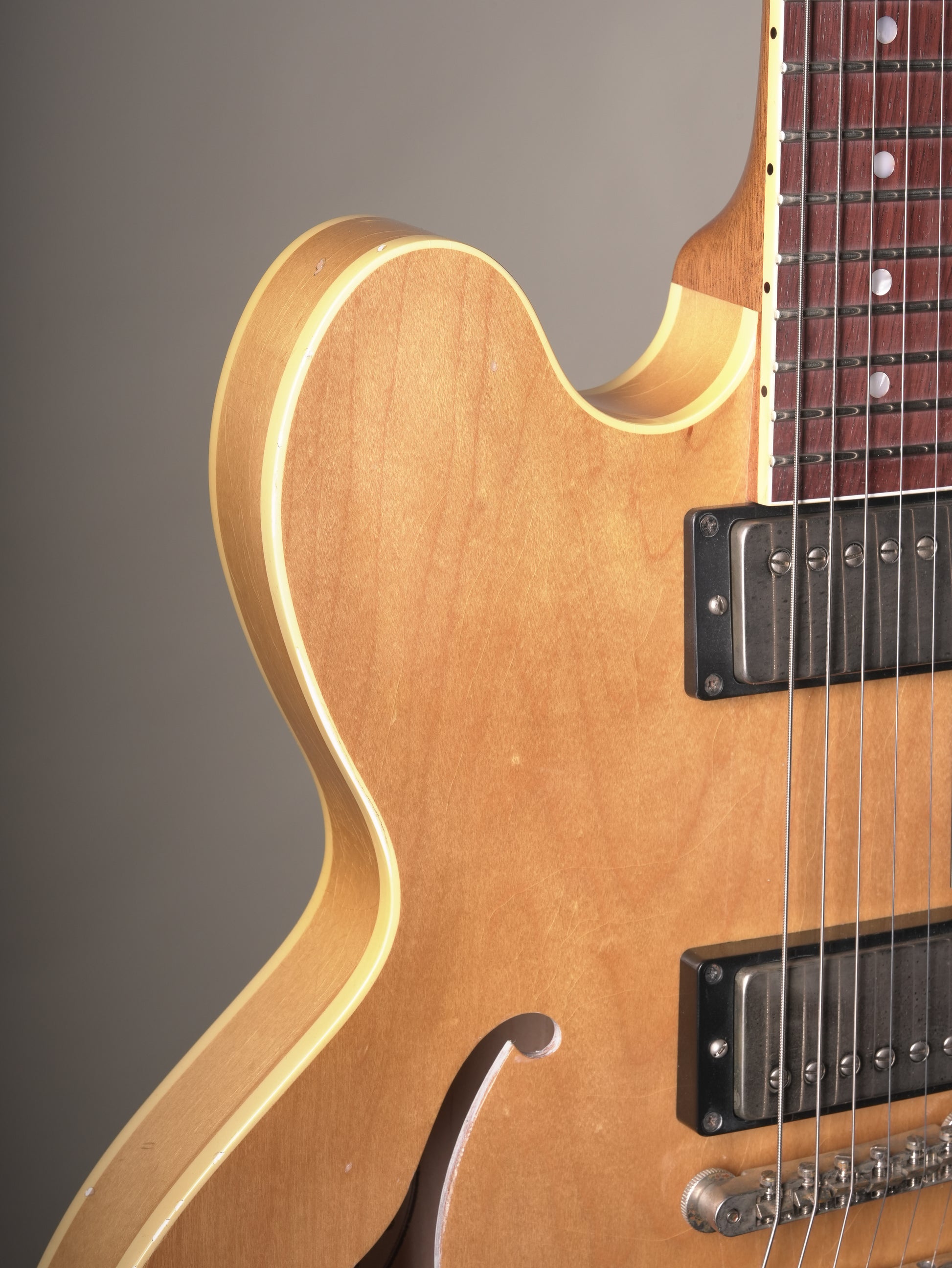 The neck shape reflects the moderately thick profile from around the mid-1950s. The rolled edges and an aging process make a comfortable feel in the hand. The neck angle is set shallow. To achieve a soft tension feel and a clear note.