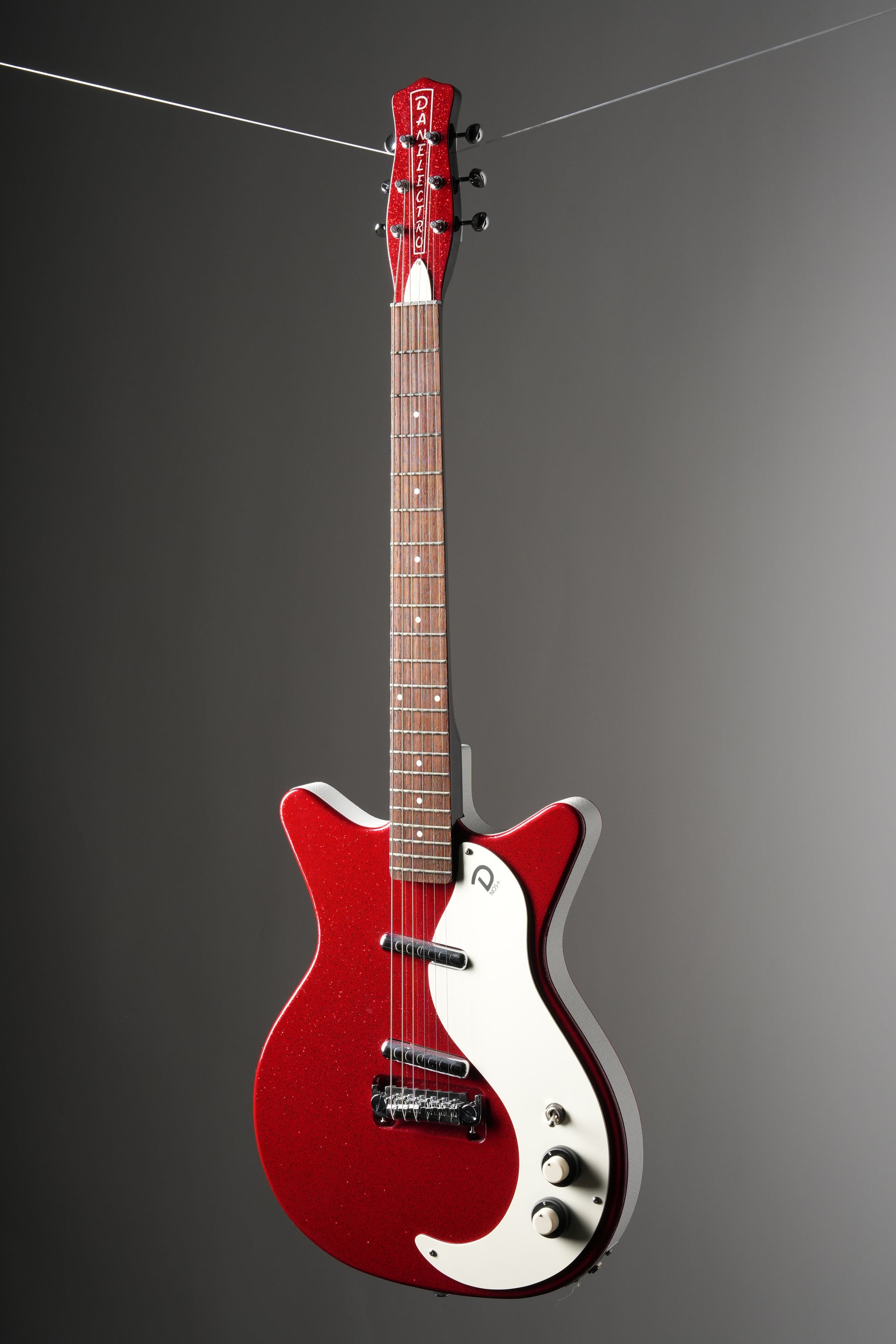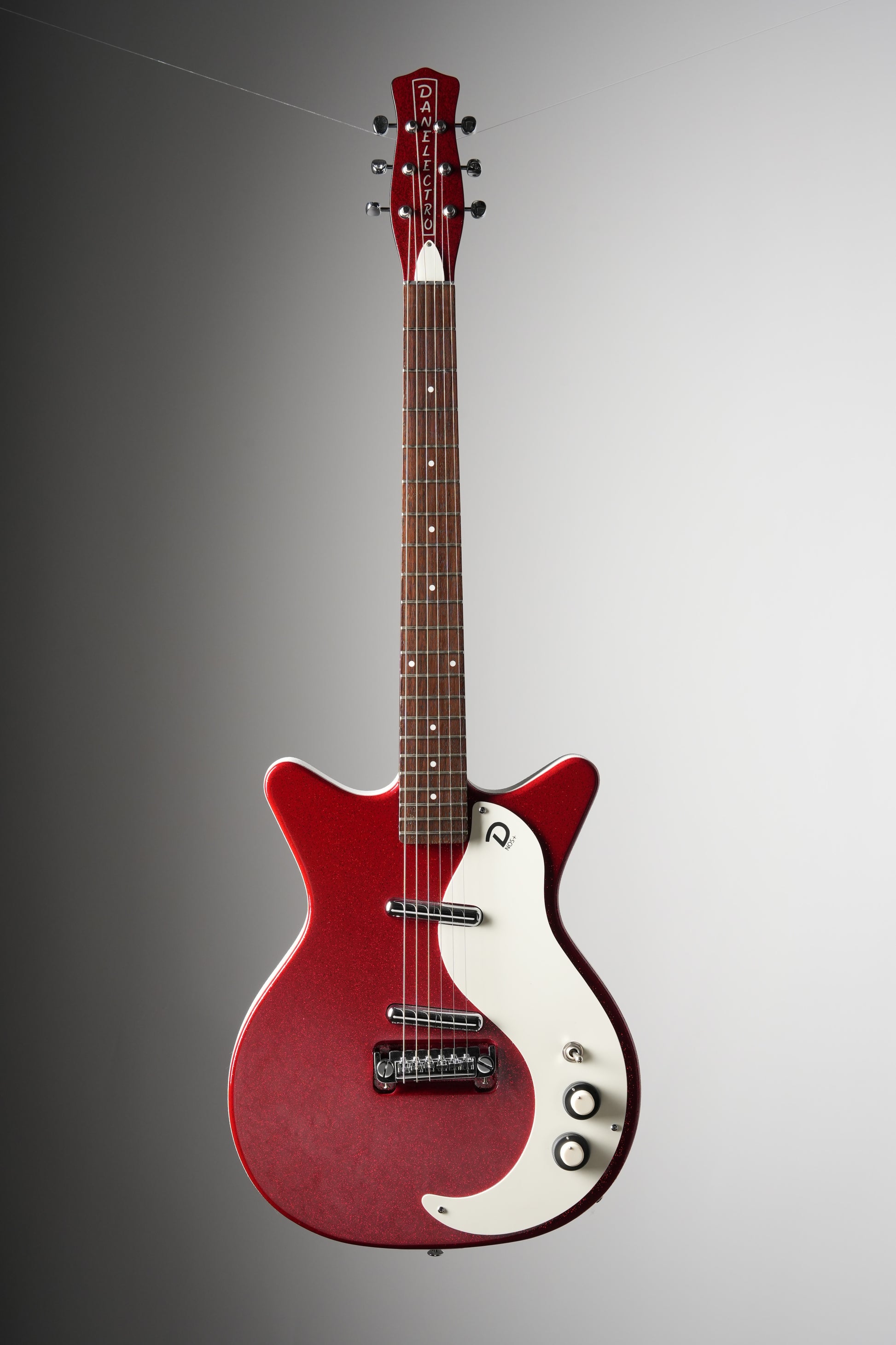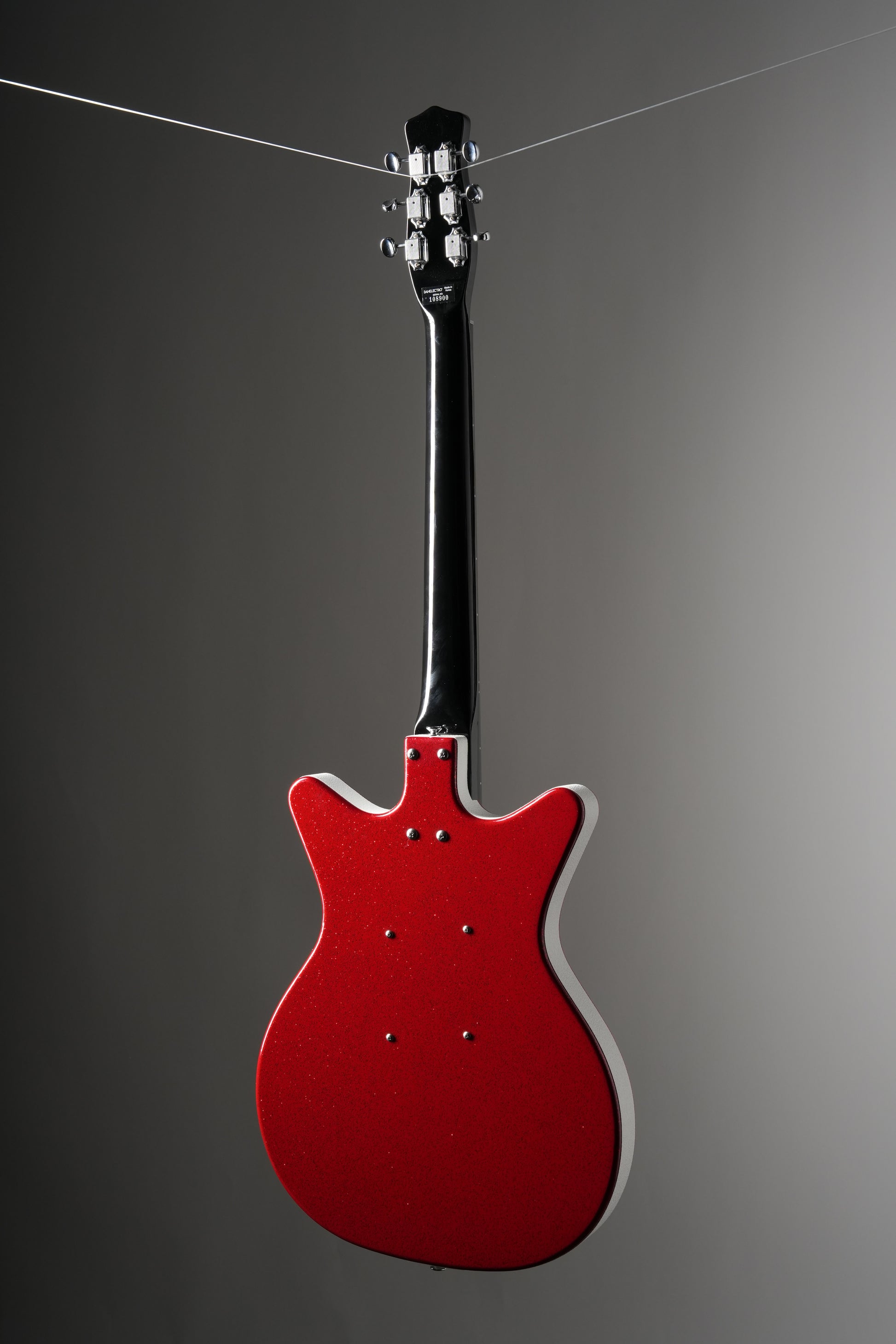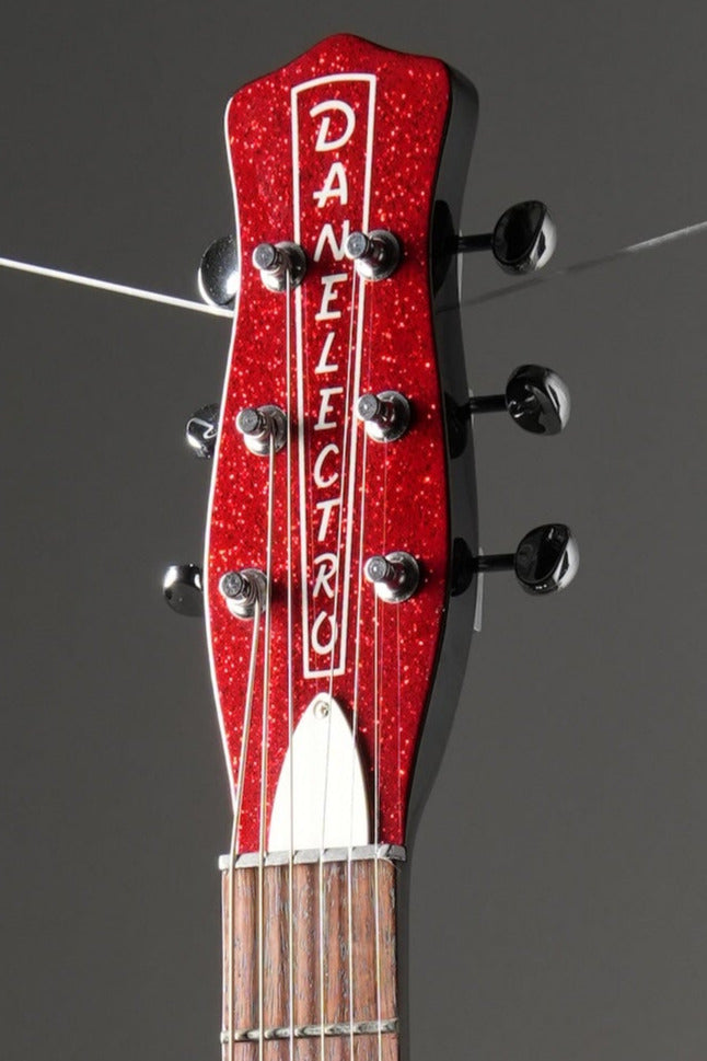 Introducing the Danelectro 59 Mod New Old Stock Red MetalFlake guitar, featuring a stunning red metal flake finish. This unique guitar offers a vintage 1950s design with modern touches, providing superior sound and playability. With its eye-catching color and expert craftsmanship, this guitar is a must-have for any musician looking to make a statement on stage.
