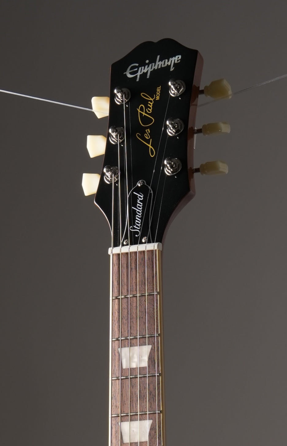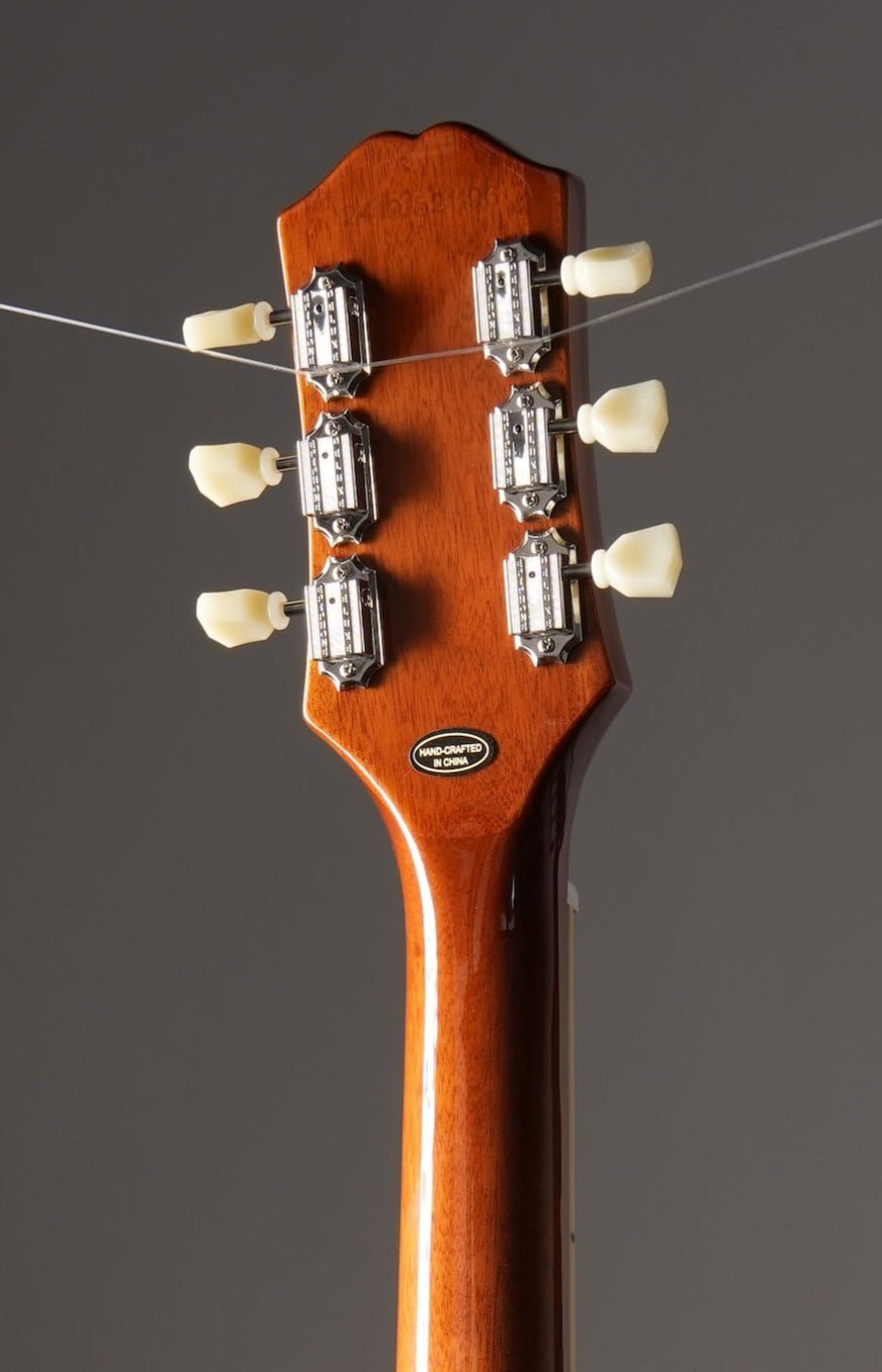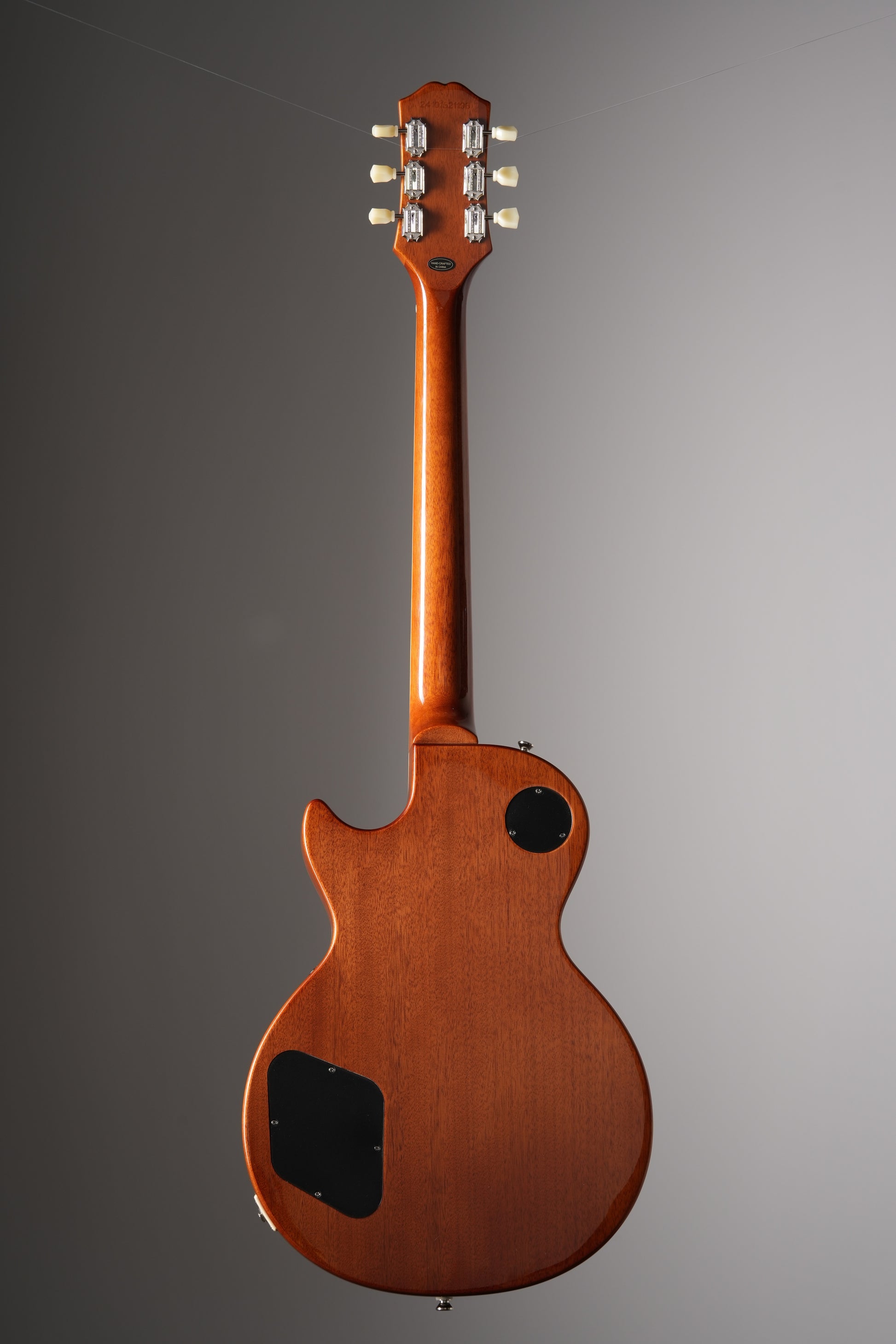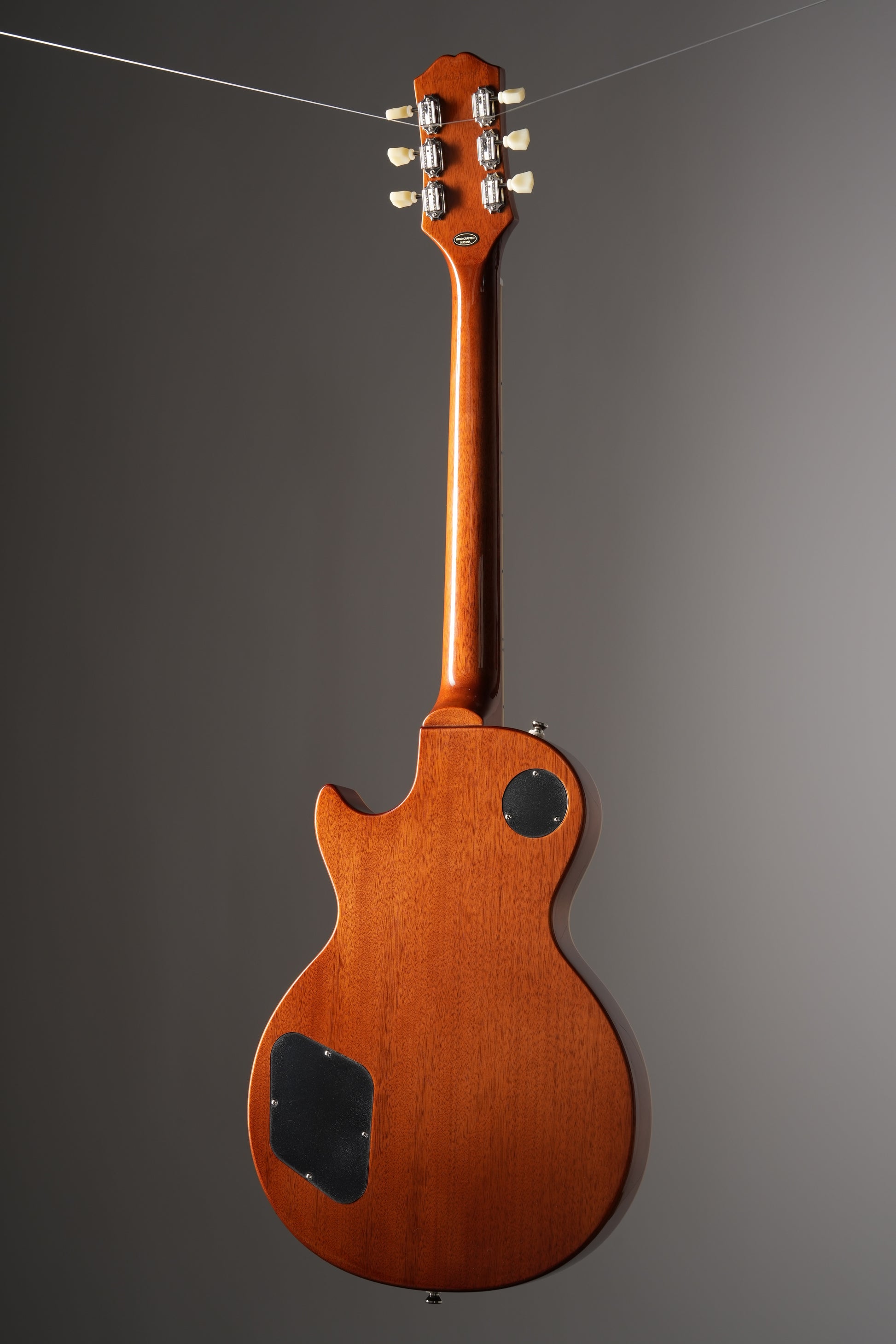 This Epiphone Inspired by Gibson Original model guitar features a mahogany body with a AAA flame maple veneer maple cap, a bound '59 Rounded Medium C-shaped mahogany neck with long neck tenon, and a laurel fretboard with classic trapezoid inlays. It is equipped with Epiphone's Vintage Deluxe tuners, a pair of Epiphone Probucker™ humbuckers™, and gold Top Hat knobs with dial pointers. Additional features include a Kalamazoo headstock, Graph Tech® nut, era-appropriate wiring, CTS® pots, and a premium gig bag.