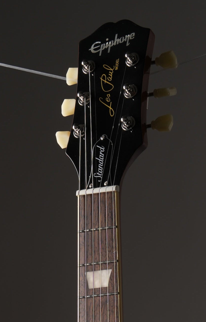 This guitar lovingly recreates the feel and tone of the 1950s-era Les Pauls. Epiphone's Vintage Deluxe tuners, a pair of critically acclaimed Epiphone Probucker™ humbuckers™, and gold Top Hat knobs with dial pointers complement the mahogany body, maple cap (AAA veneer on figured tops), bound 50s shaped mahogany neck with long neck tenon, and Indian laurel fingerboard with classic trapezoid inlays.