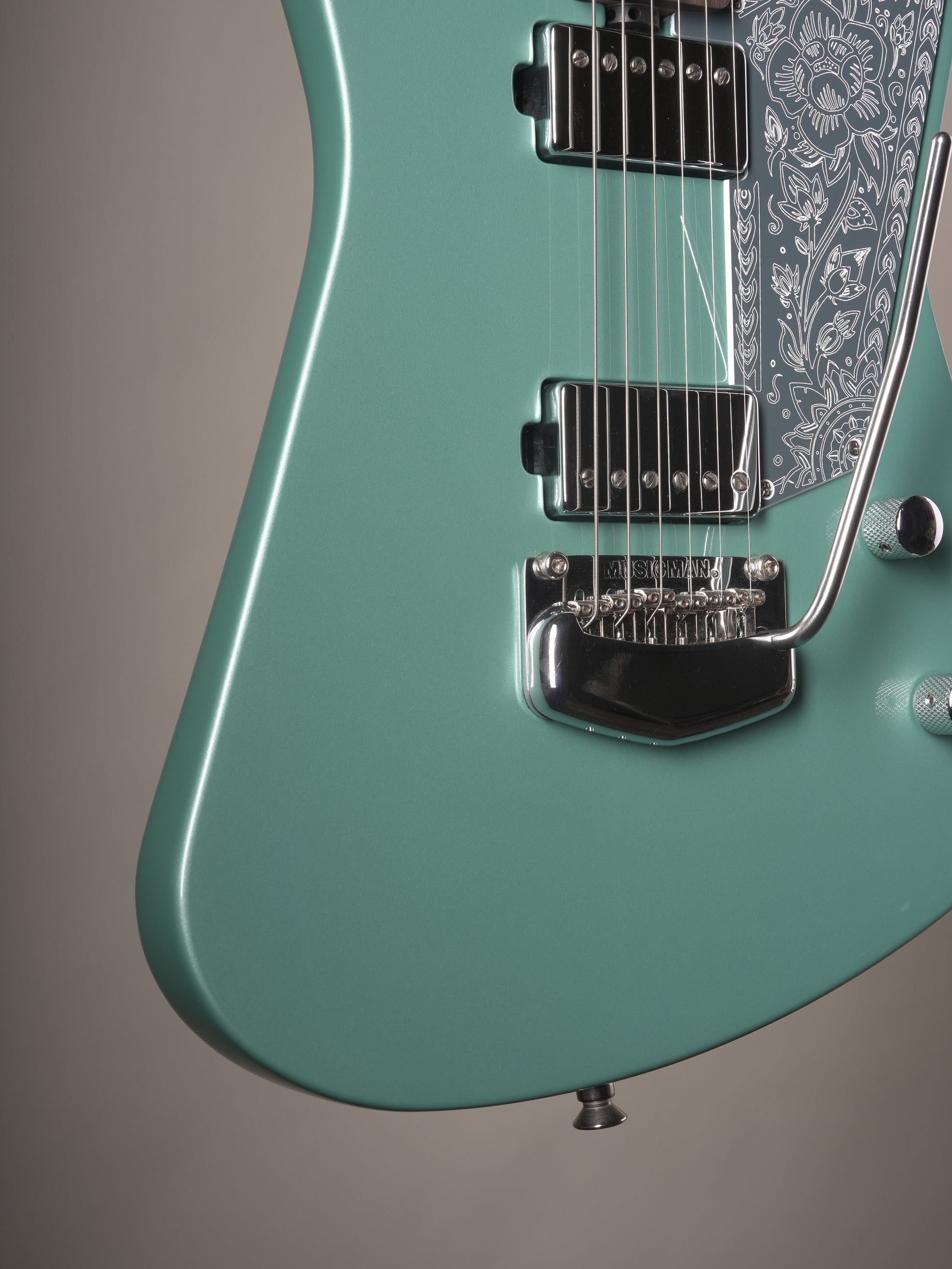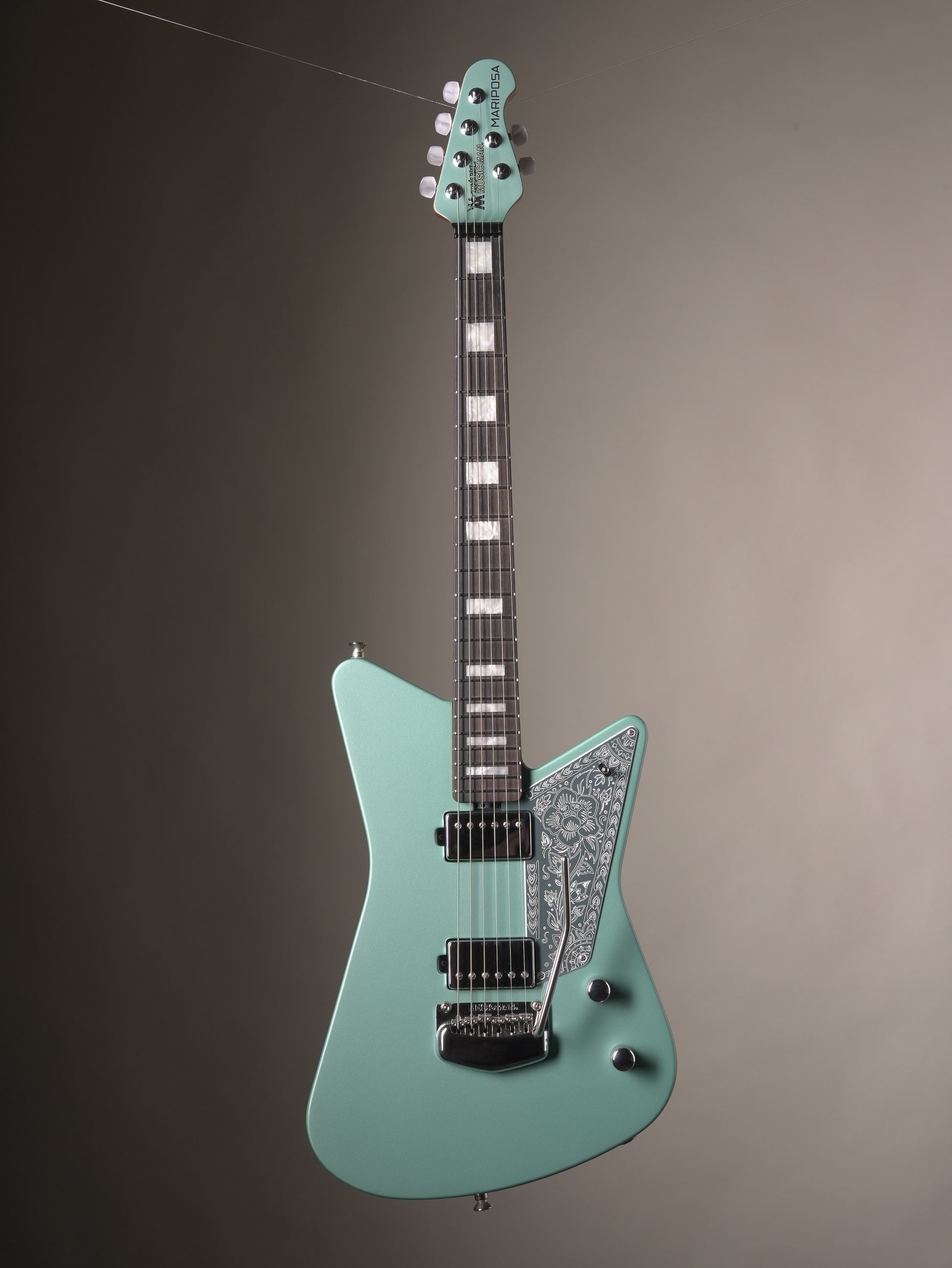 The Mariposa’s bold-yet-ergonomic okoume body reaches toward the heavens like a butterfly in flight. It’s beautifully coordinated by a laser-etched floral pickguard and a full set of matching hardware: pickup covers, bridge, tuners, and trem.