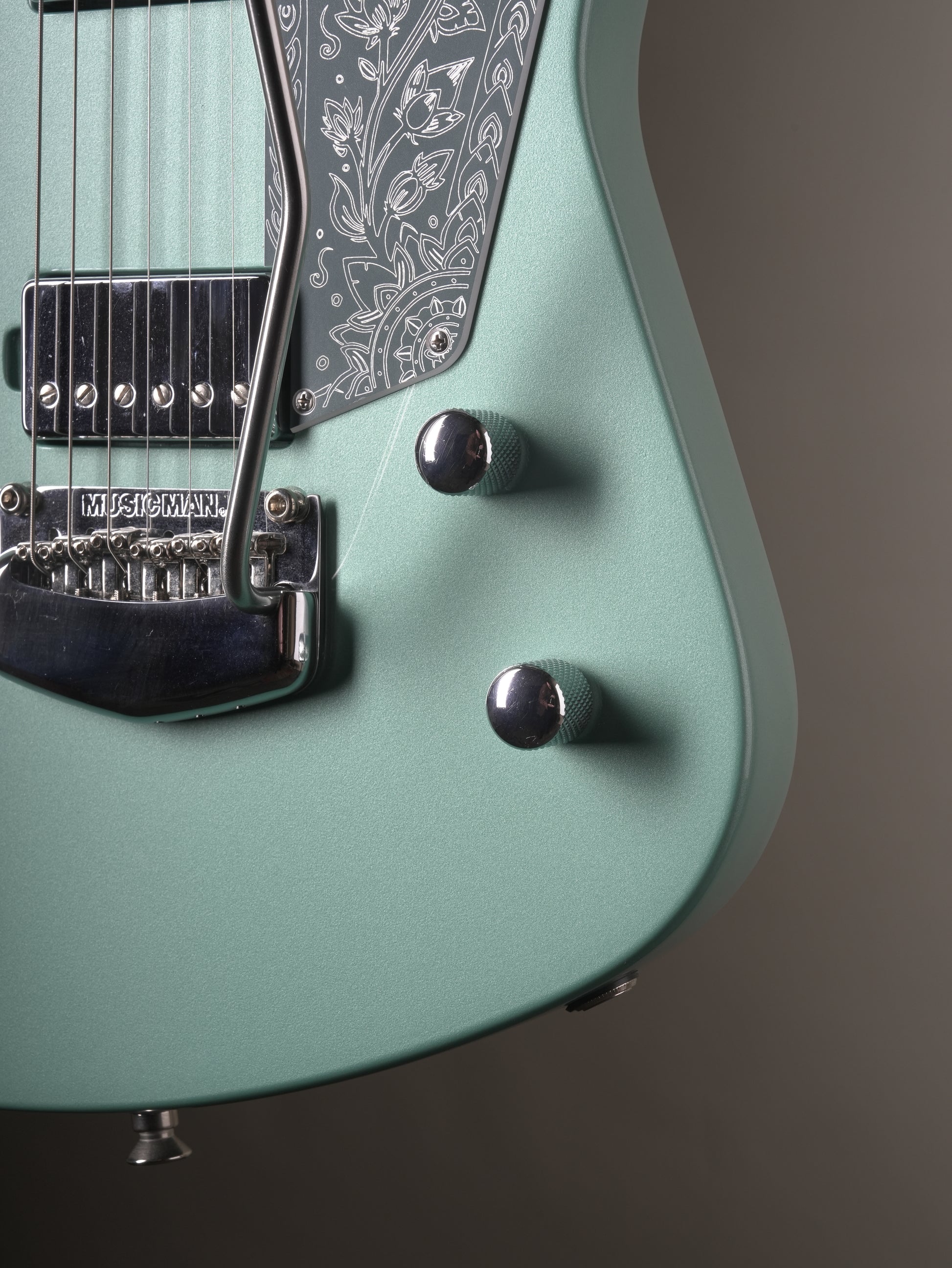 The latest muse to solo artist and former The Mars Volta axeman Omar Rodríguez-López is the Ernie Ball Music Man Mariposa electric guitar. Bold in tone, balanced in the hands, and a compelling study in tone-shaping grotesquerie, ORL’s Mariposa is the perfect tool for carving out liminal riffs and discordant textures in an all-amps-at-11 mix. Most striking are the Mariposa’s laser-etched pickguard and matching hardware. A pair of custom-wound Music Man humbuckers and simple controls take the Mariposa from classic chunk and chime to a pedal-laden blitz in a flash. All the while, Schaller locking tuners and a Music Man Modern Tremolo allow you to texture riffs to your heart’s content. Bold design