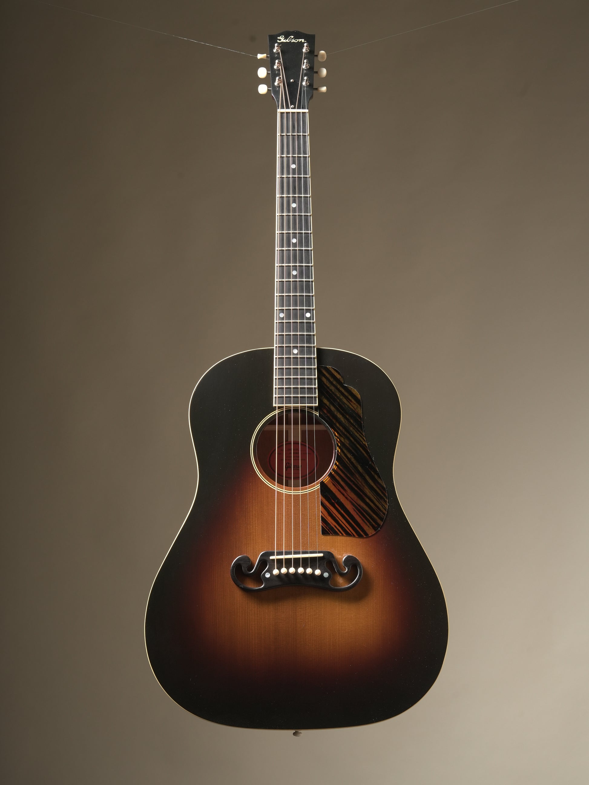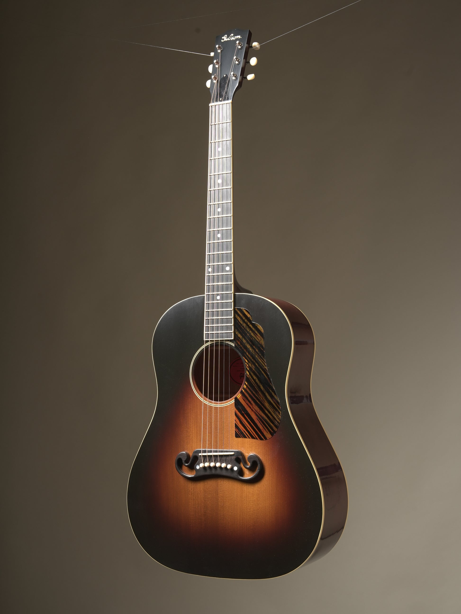 When it was released, the J-55 carried on the tradition of Gibson round-shoulder acoustic instruments. It was one of four Jumbo guitars offered by Gibson in the 1930s, becoming extremely sought after decades after its original release. The new Custom Shop 1939 J-55 features premium ebony on the fingerboard and bridge, a long-scale neck, and a thermally aged Adirondack red spruce top. Distinctive custom additions include a Moustache™ bridge, terraced fire stripe pickguard, and a wide 1.77" nut width.