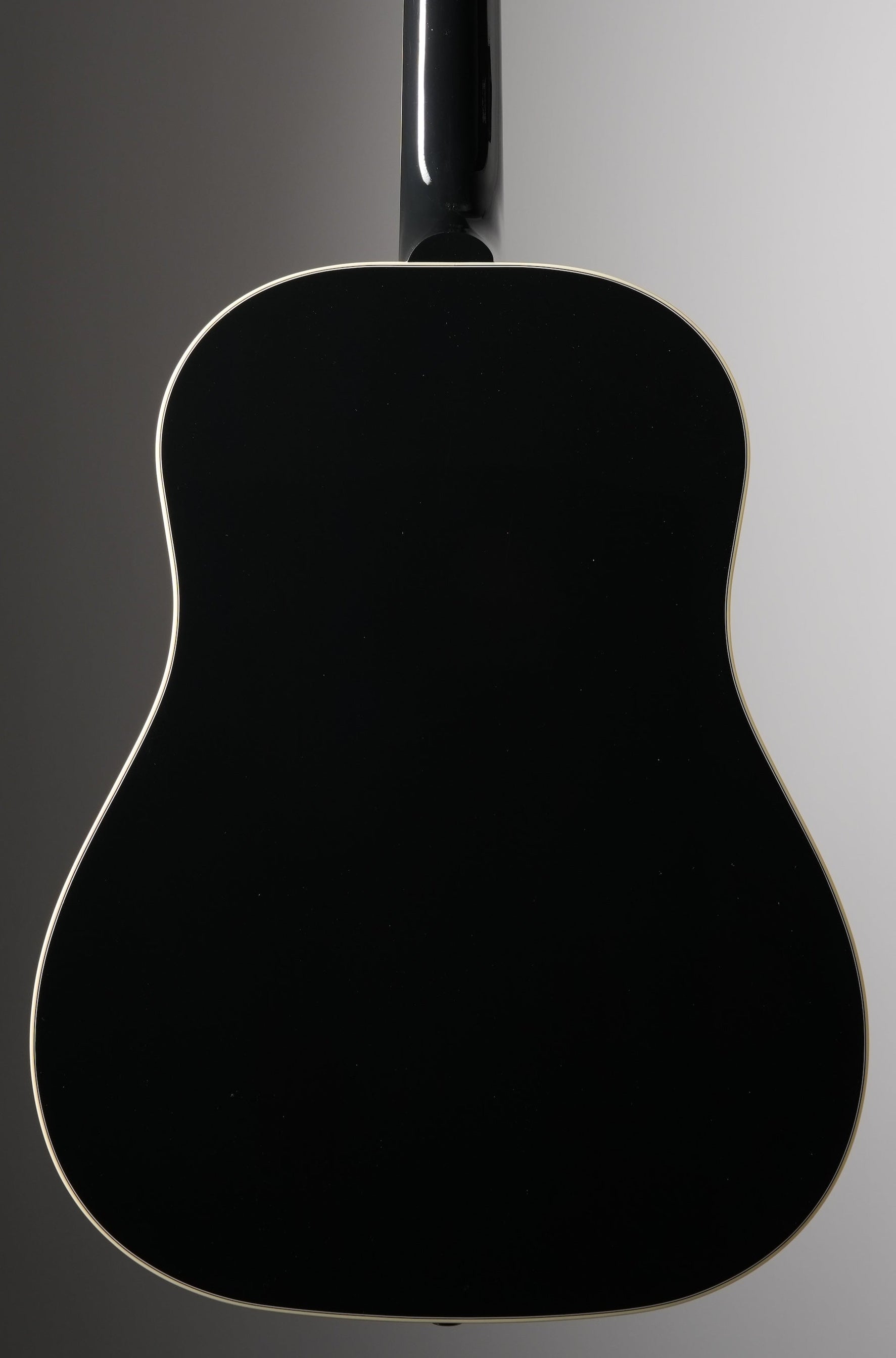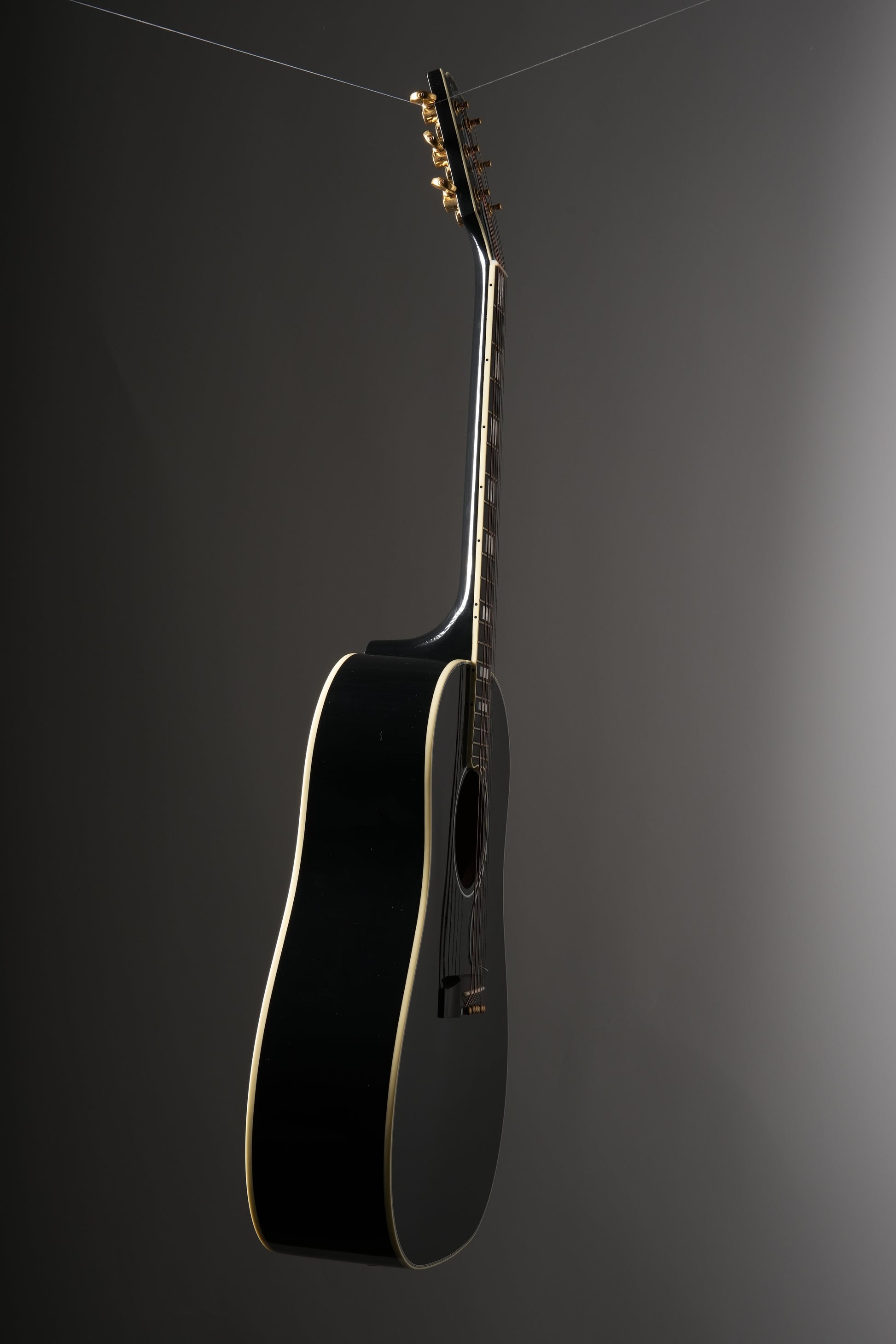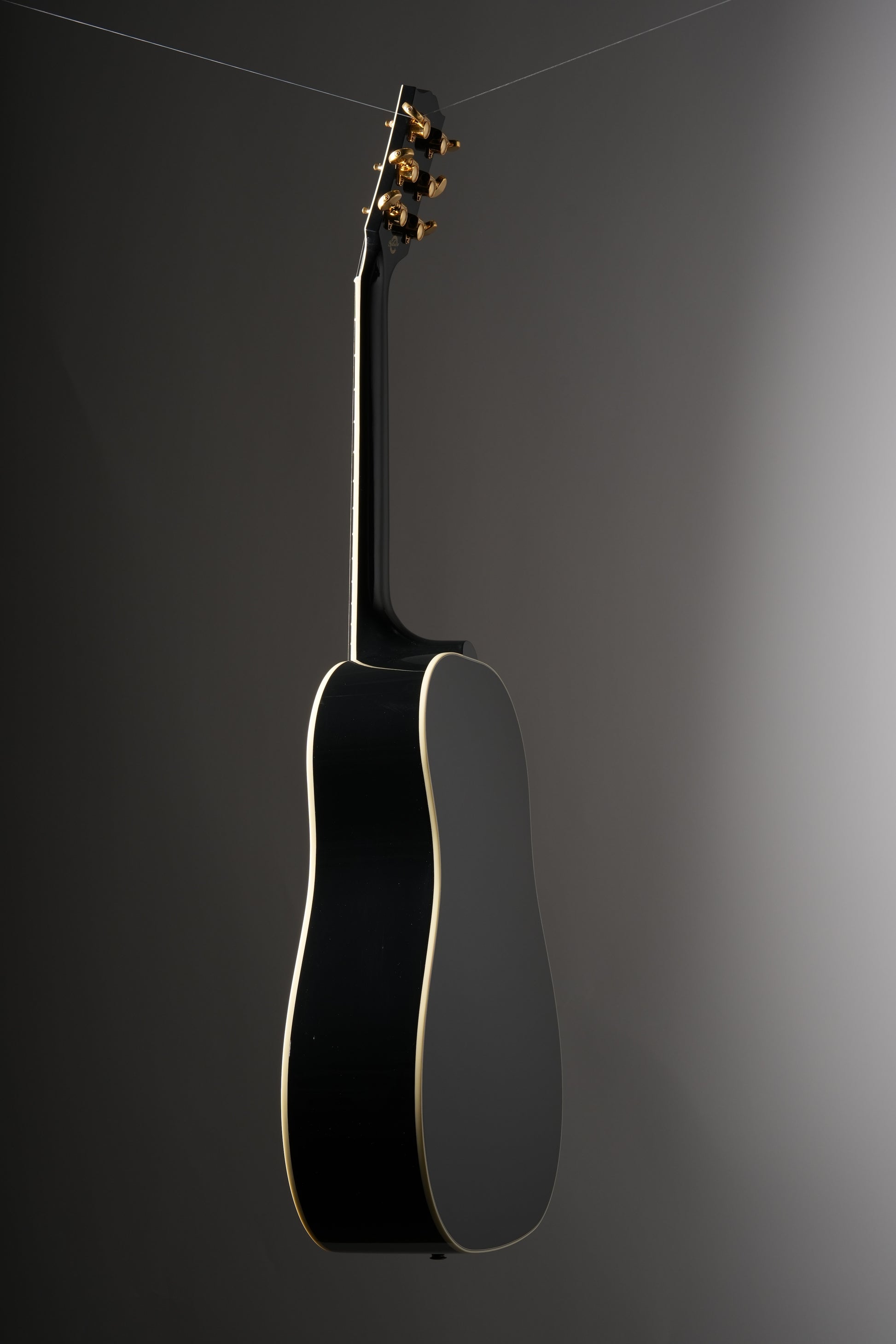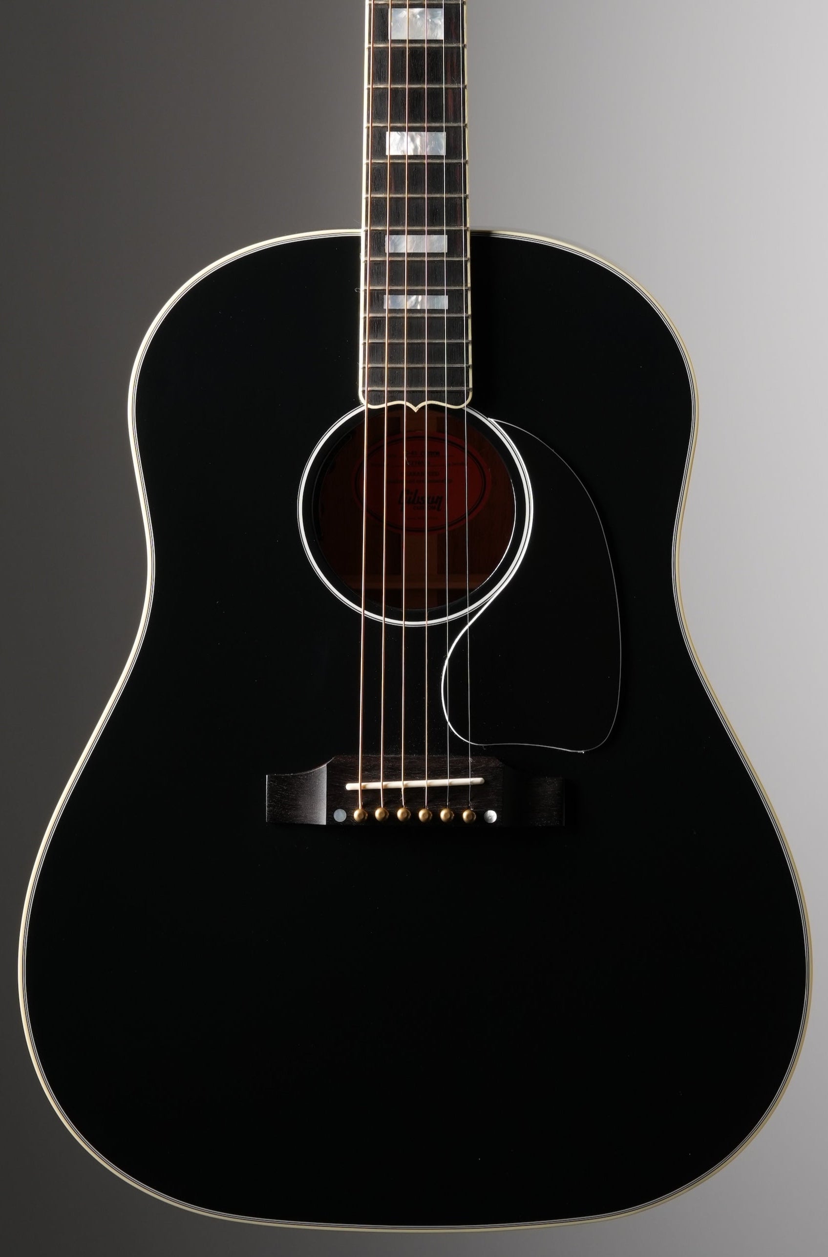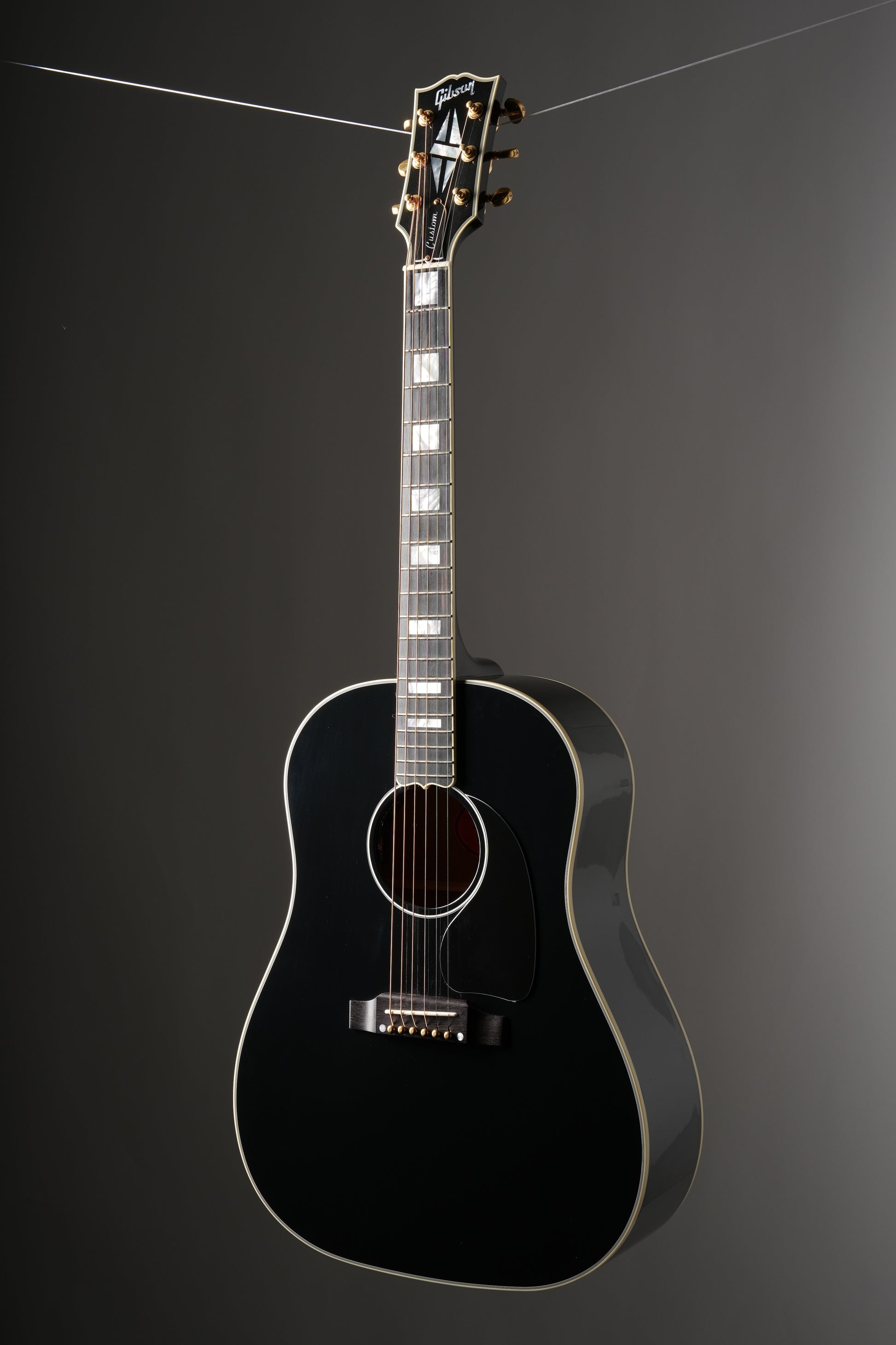 The J-45 Custom, inspired by the Les Paul™ Custom, has an Ebony nitrocellulose lacquer finish, multi-ply binding on the top and back, and a bound Les Paul-style peghead with a Custom split diamond inlay in mother of pearl. It also features a bound ebony fretboard with mother of pearl Custom Block inlays, and gold Grover® Rotomatic® tuners.