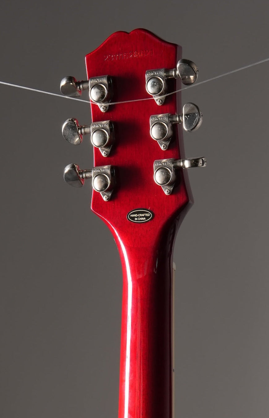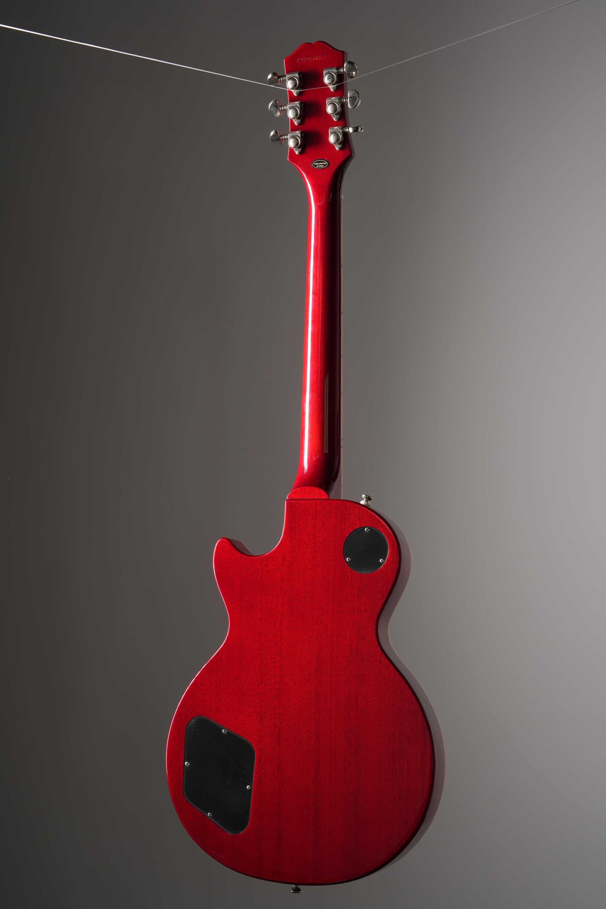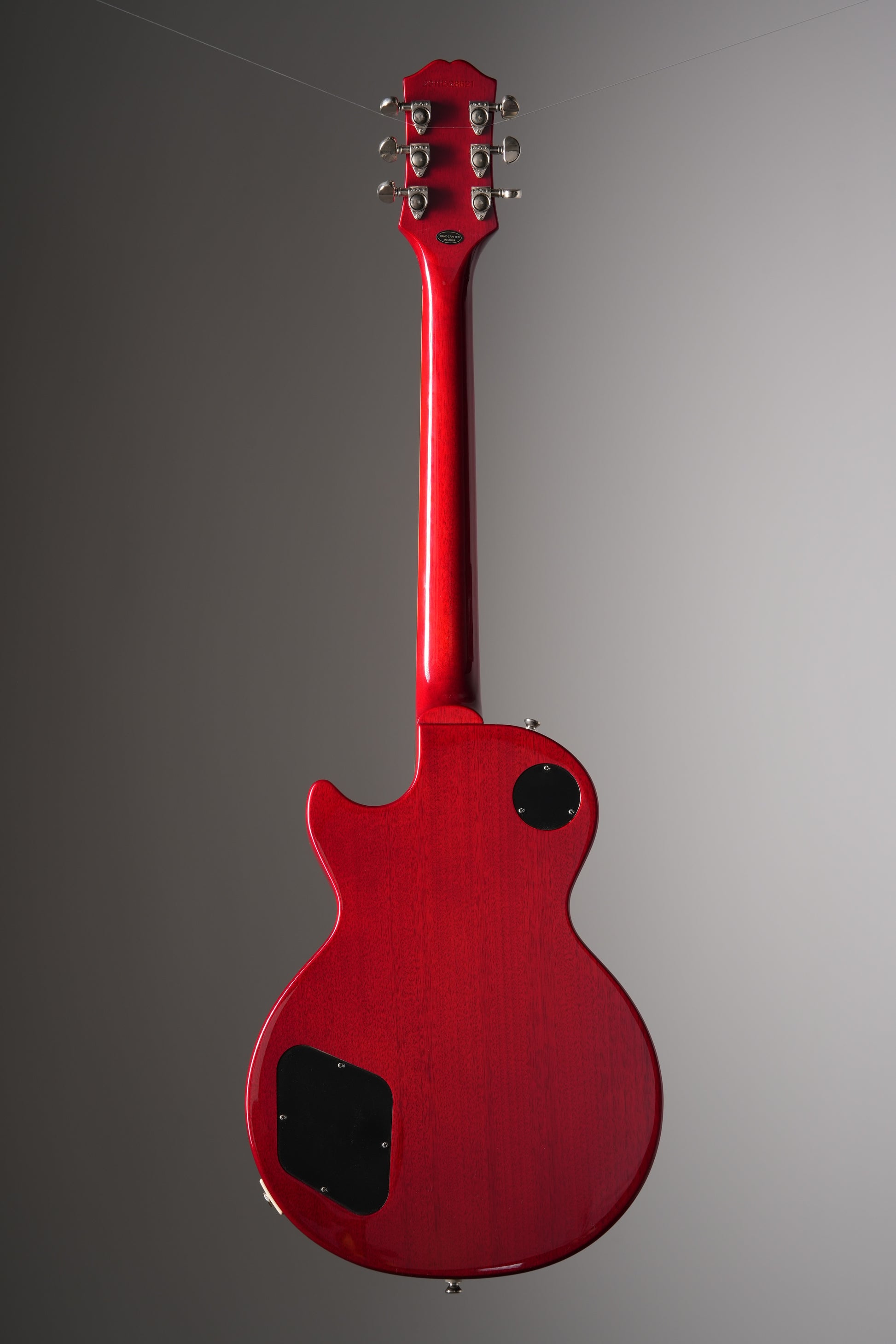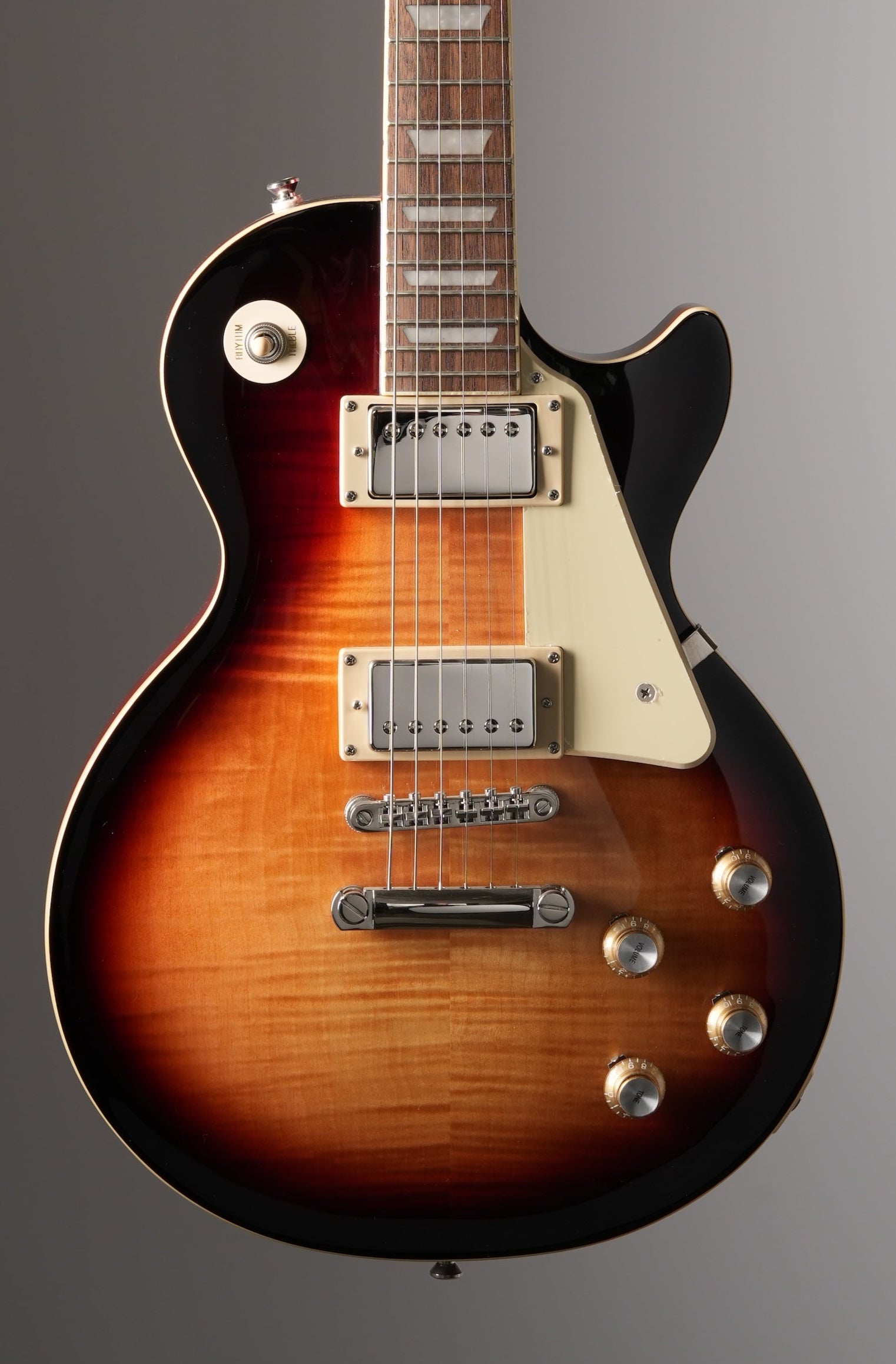This Epiphone Inspired by Gibson Original model guitar features a mahogany body with a maple cap and AAA flame maple veneer. It has a bound '59 Rounded Medium C-shaped mahogany neck with a long neck tenon, and a laurel fretboard with classic trapezoid inlays. The guitar is equipped with Epiphone's Vintage Deluxe tuners, a pair of Epiphone Probucker™ humbuckers™, and gold Top Hat knobs with dial pointers. Additional features include a Kalamazoo headstock, Graph Tech® nut, era-appropriate wiring, CTS® pots, and a premium gig bag.