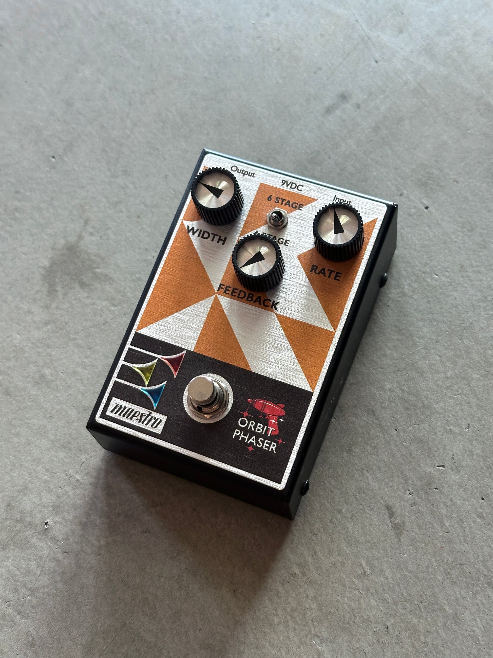 Drawing inspiration from the groundbreaking Maestro PS-1, the Maestro Orbit Phaser delivers the classic, warm, and smooth analog phasing sounds musicians crave. It offers the versatility to craft a wide range of phaser effects, thanks to a two-position Mode switch for selecting between 4- or 6-stage phasing. Its user-friendly control layout allows you to easily adjust the intensity, feedback, and speed of the phasing effect. The true bypass footswitch activates the LED lights in the iconic bugles logo when the effect is engaged.
