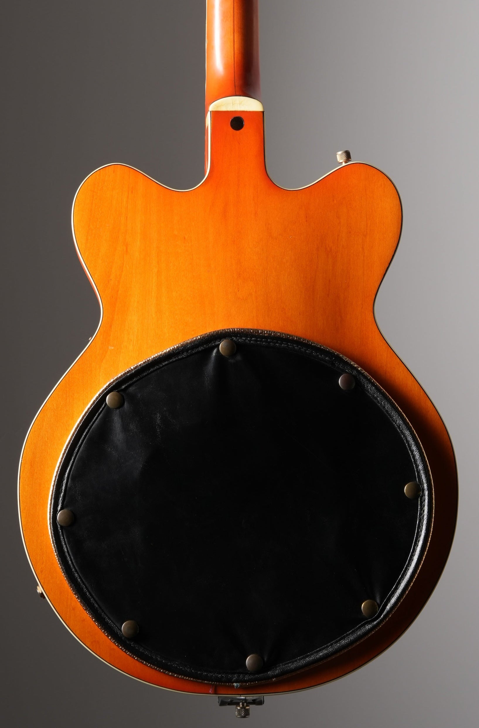 - Simulated (painted) F holes, two-piece maple neck; finish is faded; some binding discoloration.