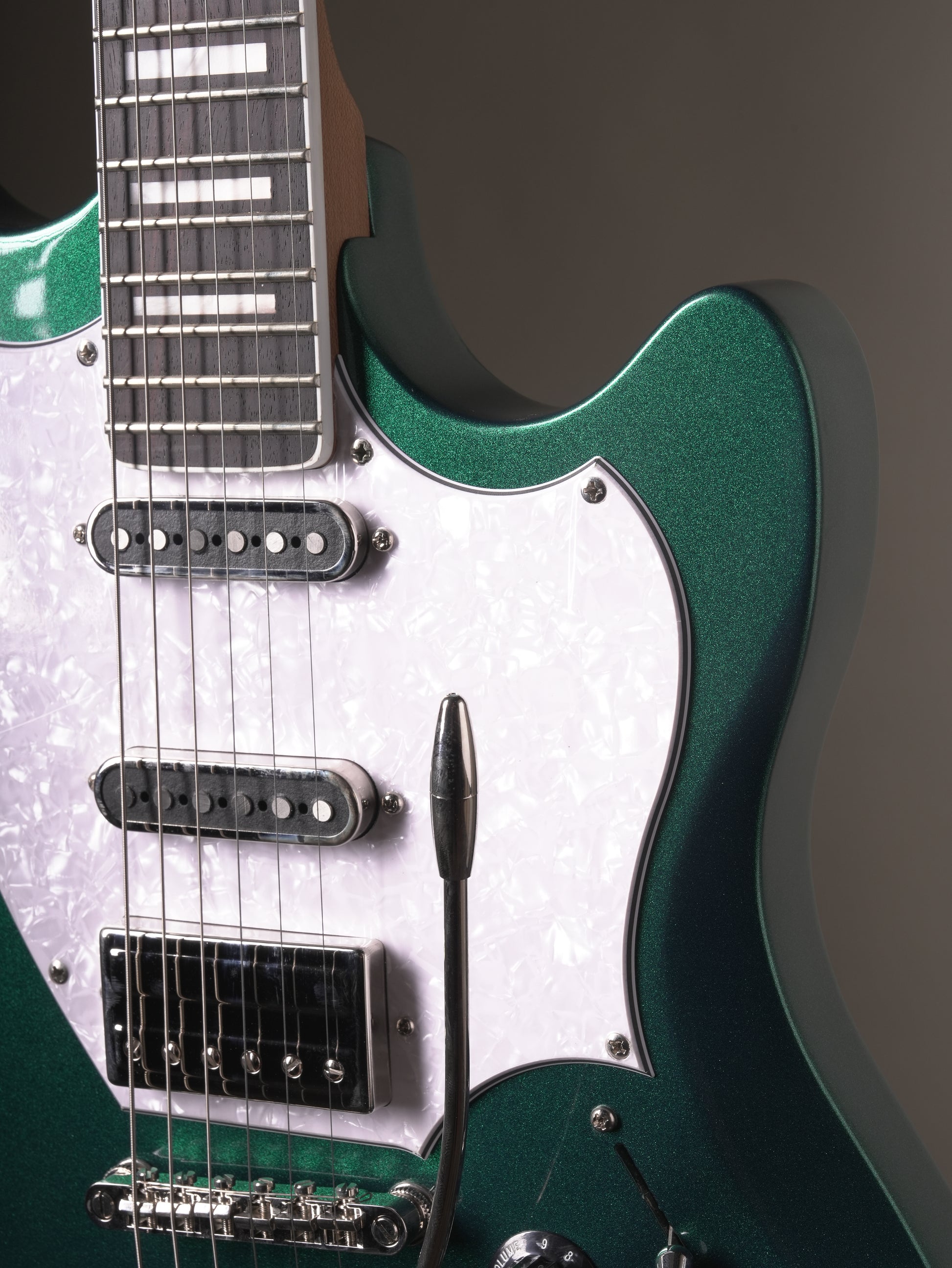 Guild’s Surfliner Deluxe Evergreen Metallic elevates the classic Surfliner with an offset guitar design featuring a vintage-style 2-piece vibrato unit, delivering smooth, fluid vibrato and a sharp, responsive tone. This Deluxe model enhances playability and aesthetics with a maple neck, rosewood fingerboard with block inlays and binding, and a matching painted headstock. Its lightweight poplar body houses a versatile HSS pickup setup—combining a Guild HB-2 humbucker at the bridge with two DeArmond Aerosonic single-coils—offering everything from authentic surf sounds to powerful rock tones.