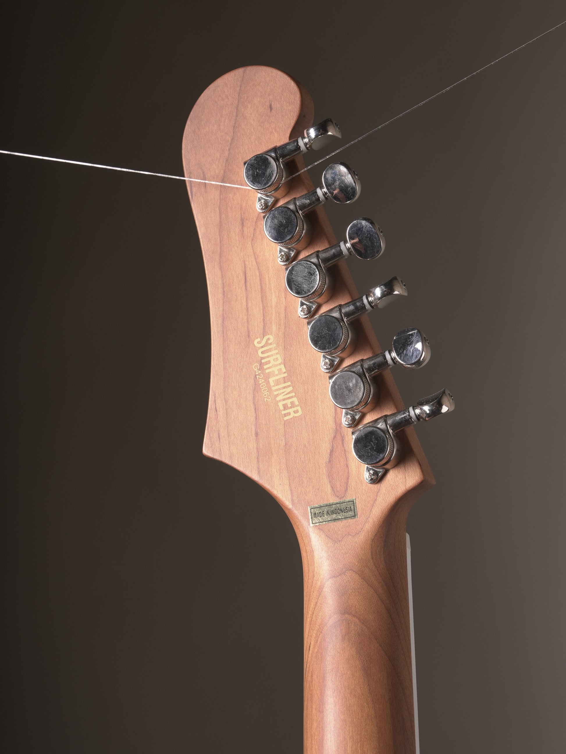 Guild’s Surfliner elevates the classic Surfliner with an offset guitar design featuring a vintage-style 2-piece vibrato unit, delivering smooth, fluid vibrato and a sharp, responsive tone. This Deluxe model enhances playability and aesthetics with a maple neck, rosewood fingerboard with block inlays and binding, and a matching painted headstock. Its lightweight poplar body houses a versatile HSS pickup setup—combining a Guild HB-2 humbucker at the bridge with two DeArmond Aerosonic single-coils—offering everything from authentic surf sounds to powerful rock tones.