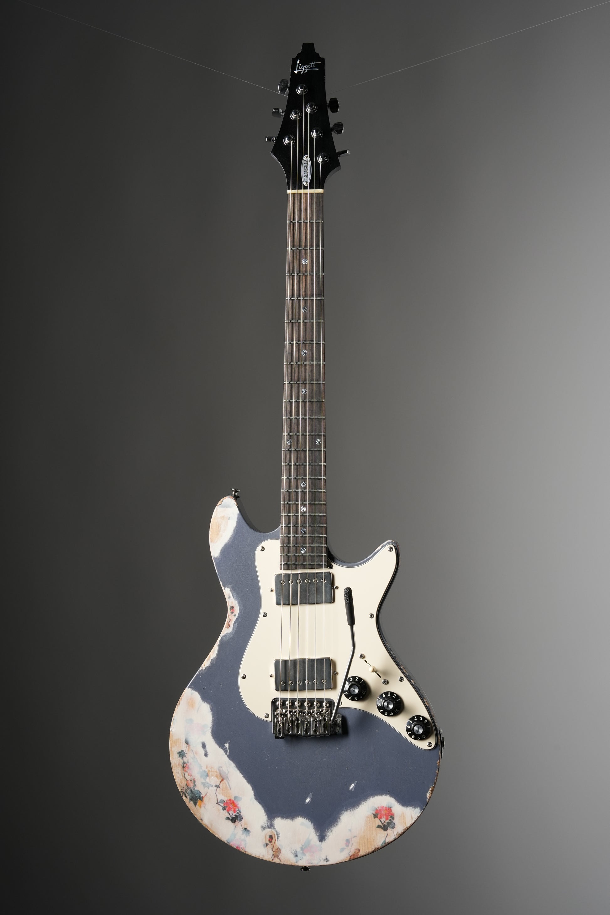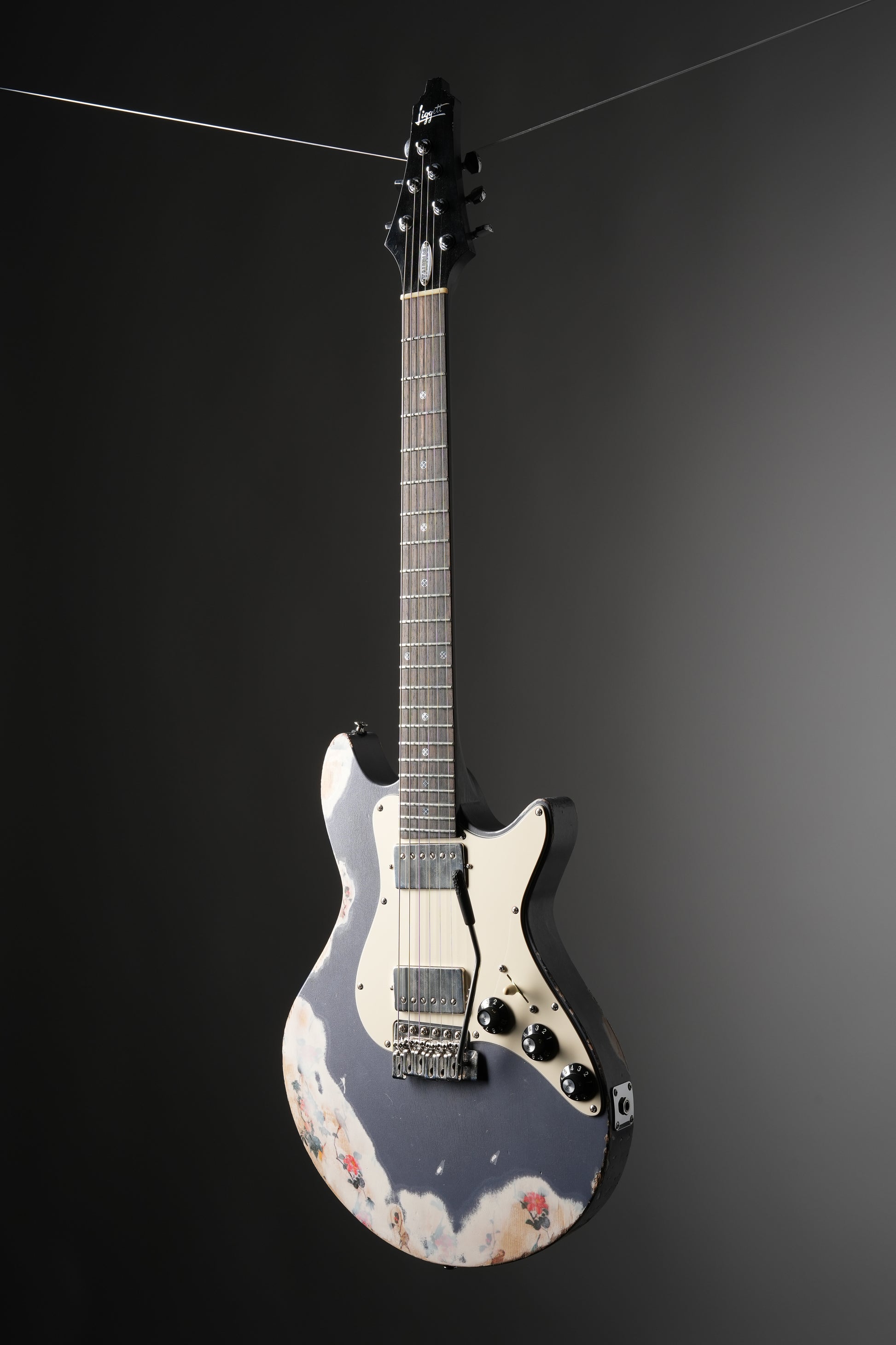 This Liggett Guitars Taurus (#3) was crafted with a Sitka Spruce chambered body and Sitka Spruce, carbon reinforced neck. Ebony makes up the fingerboard and headstock overlay, with Taurus engraved fingerboard inlays. The Metallic Silver over Japanese Block Print is finished in Nitro and is heavily & tastefully relic'ed.
