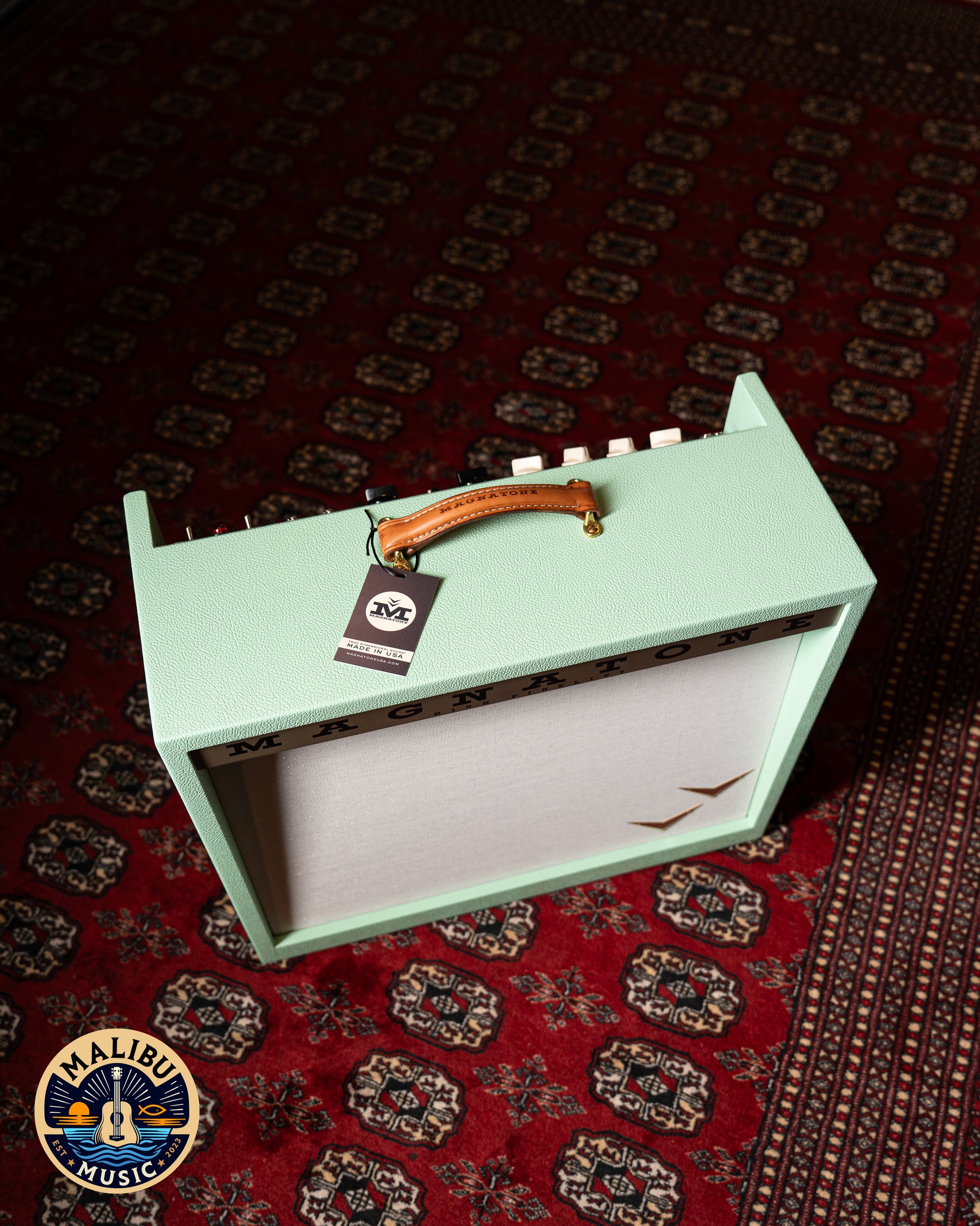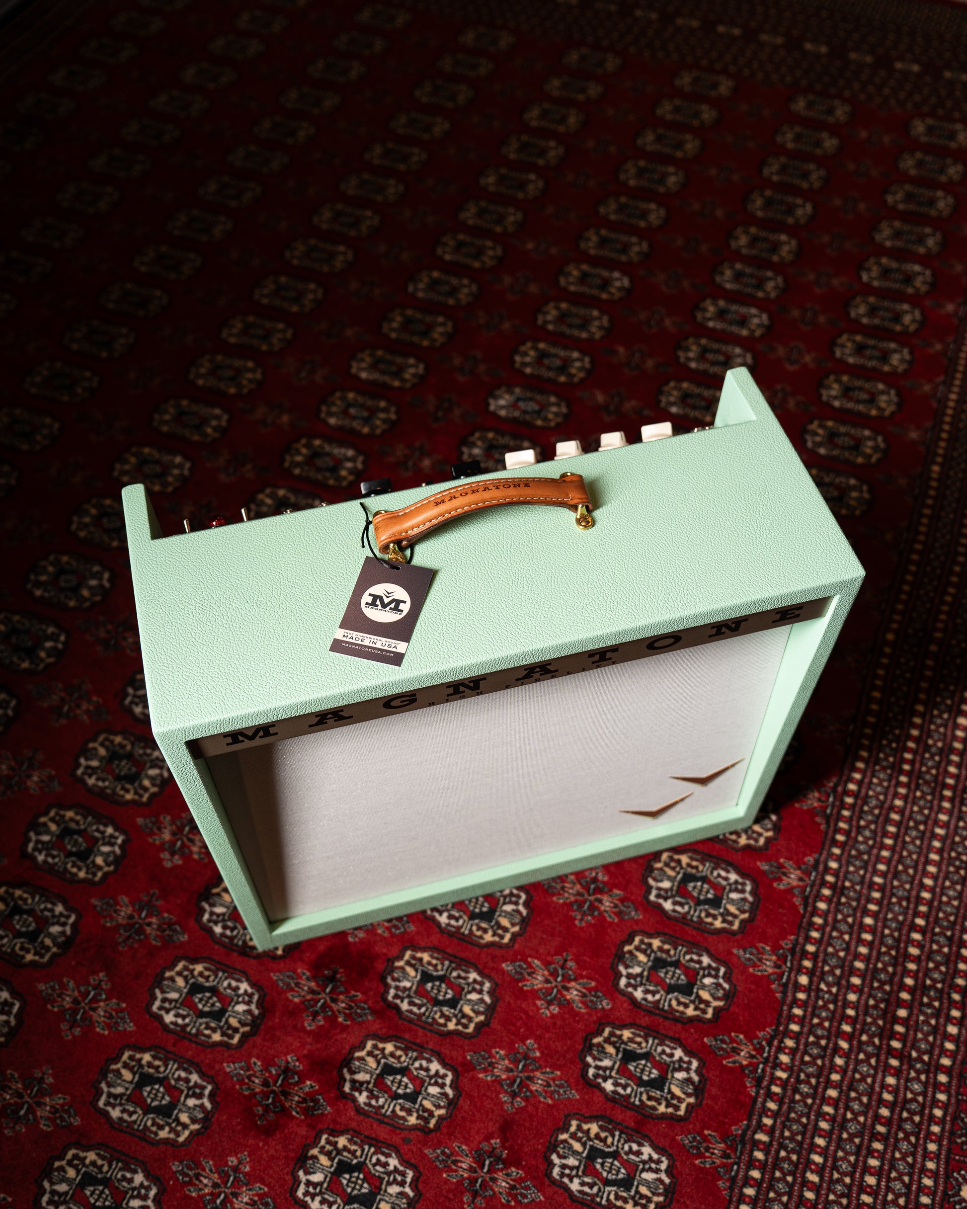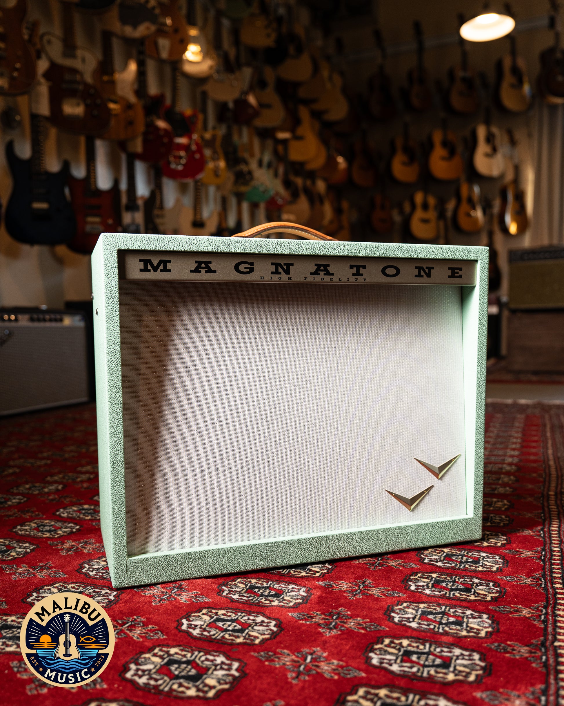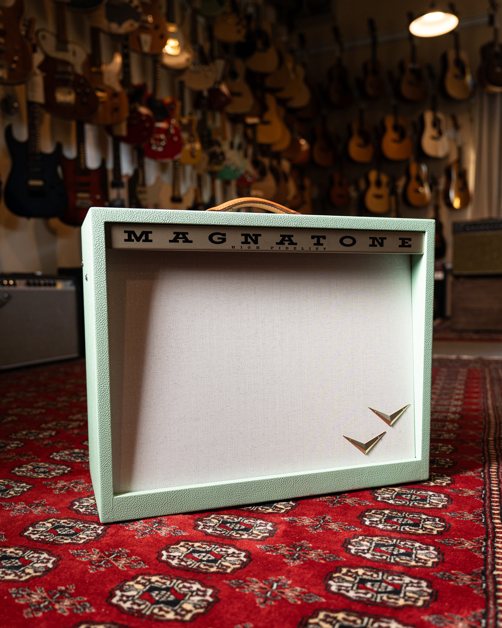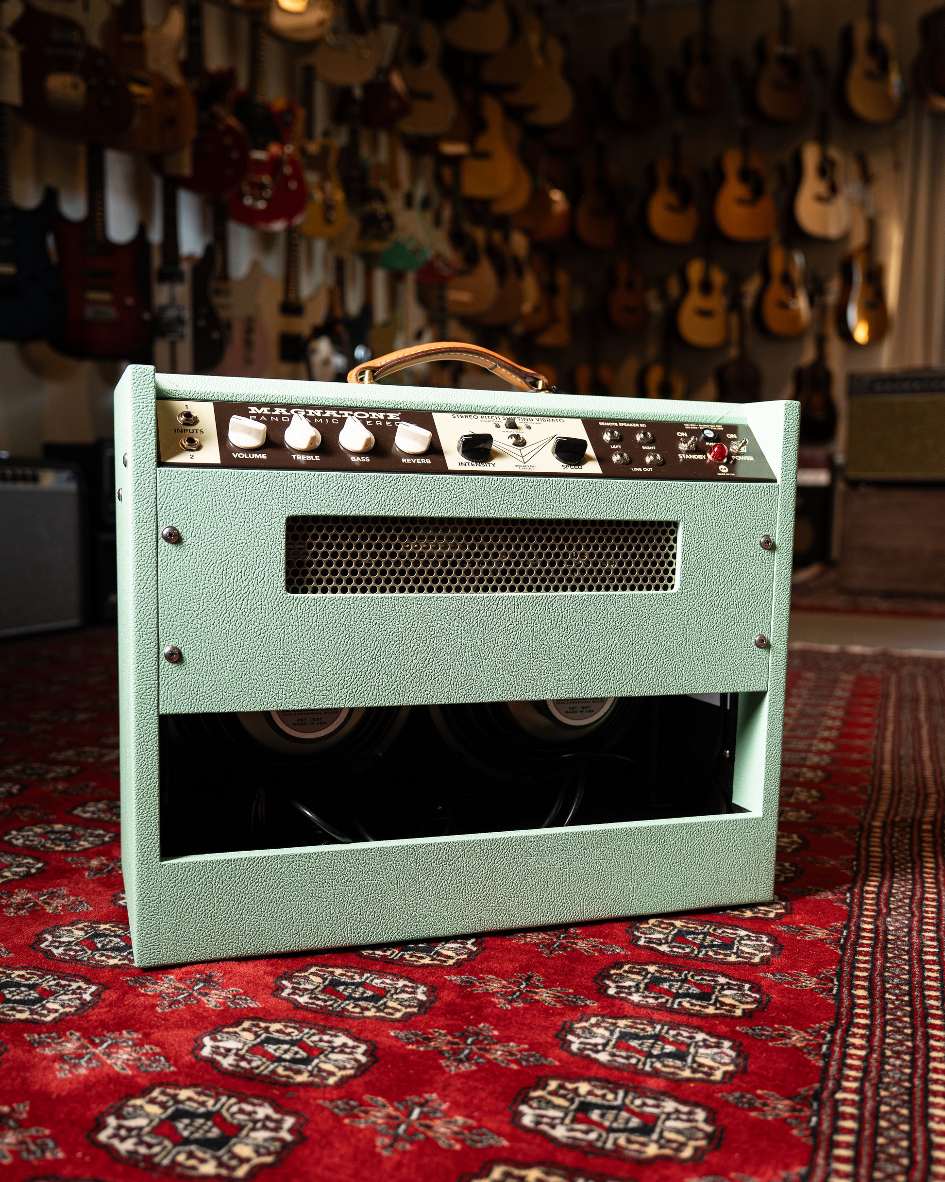 Clothed in custom Seafoam Green, the Panoramic Stereo brings the Magnatone stereo experience to a smaller , more convenient size. Two 10" speakers are powered by four EL84s push pull 12+12 watts of all tube stereo power for a very compact and wide sounding amplifier.