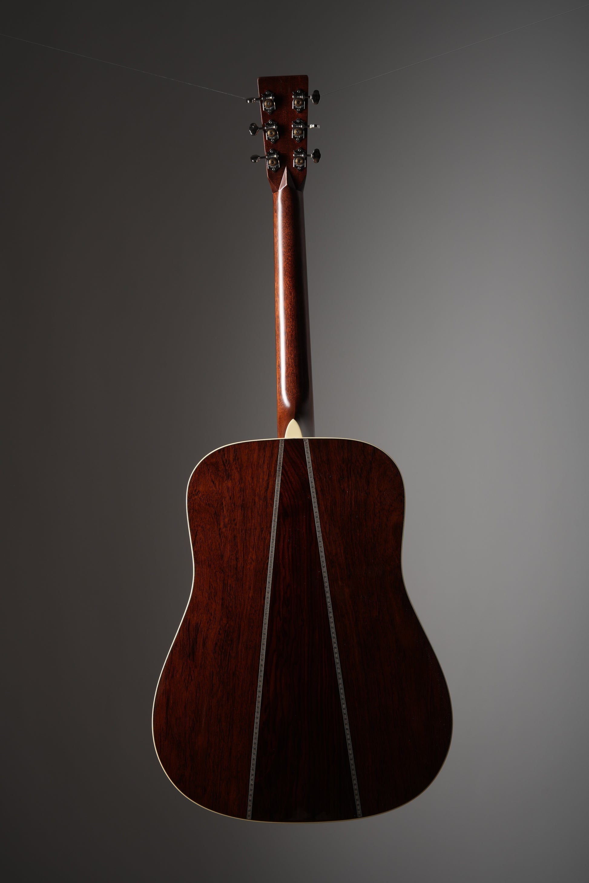 Prior to the release of the Super D, Martin had only produced the D-45S Authentic 1936 which was slightly oversized. This new Super Dreadnought (The Super D) is now the largest body size in Martin’s product line. With an internal air volume of approximately twenty percent greater than the standard Dreadnought, it boasts a boosted bass output while still maintaining accurate mid and treble frequencies. Designed with a new proprietary bracing pattern, it maximizes tone and volume. The Super D underwent acoustic testing which showed a favorable 12dB gain compared to a standard Dreadnought in a controlled environment. With an extended dynamic range and increased volume, the Super D is effortless to play and outperforms all other instruments bearing the C.F. Martin logo. The overall appearance stays proportional and remains true to the legendary Dreadnought shape. With a standard scale length and depth, this new design is suitable for artists of all skill levels and genres. This model is available in high
