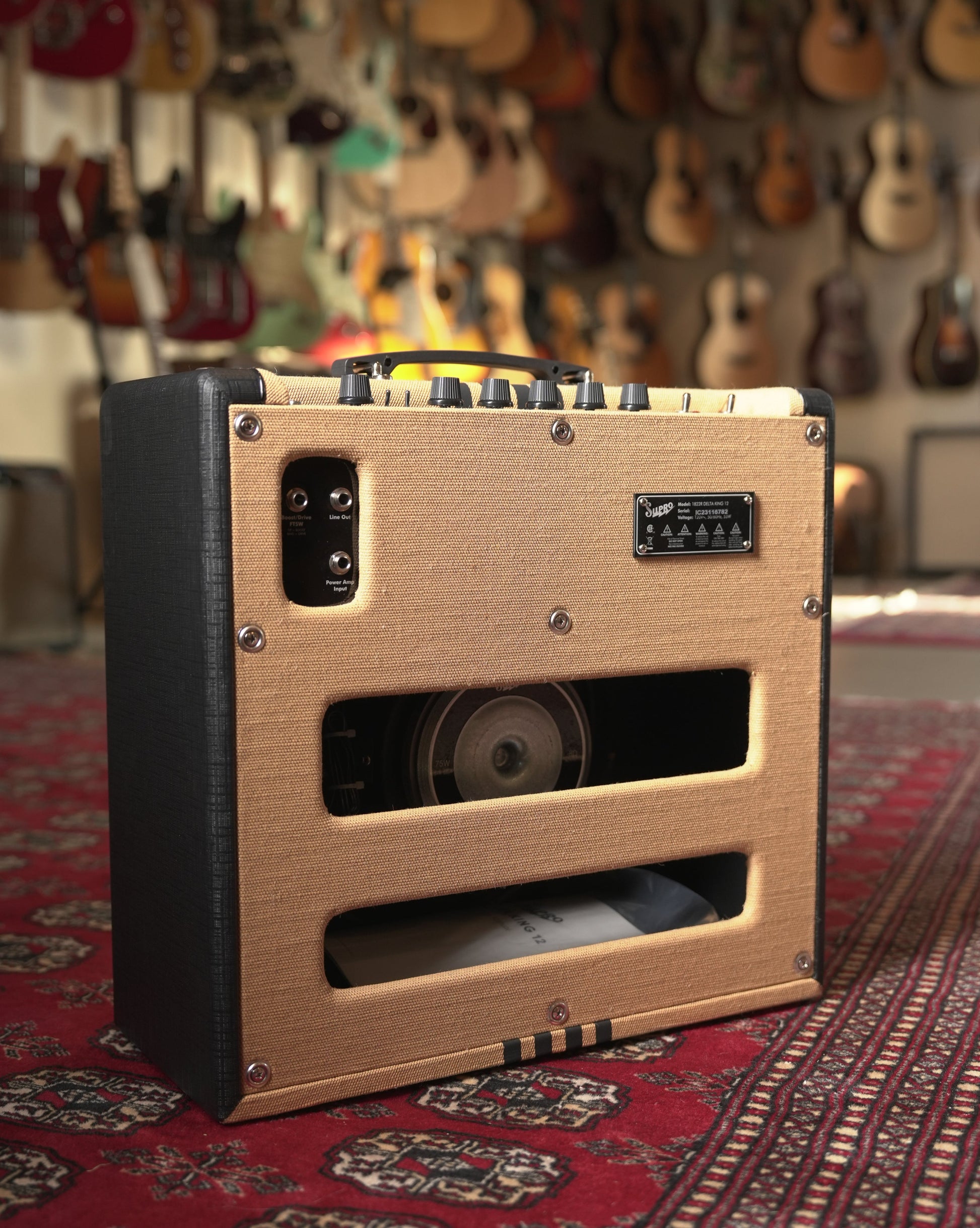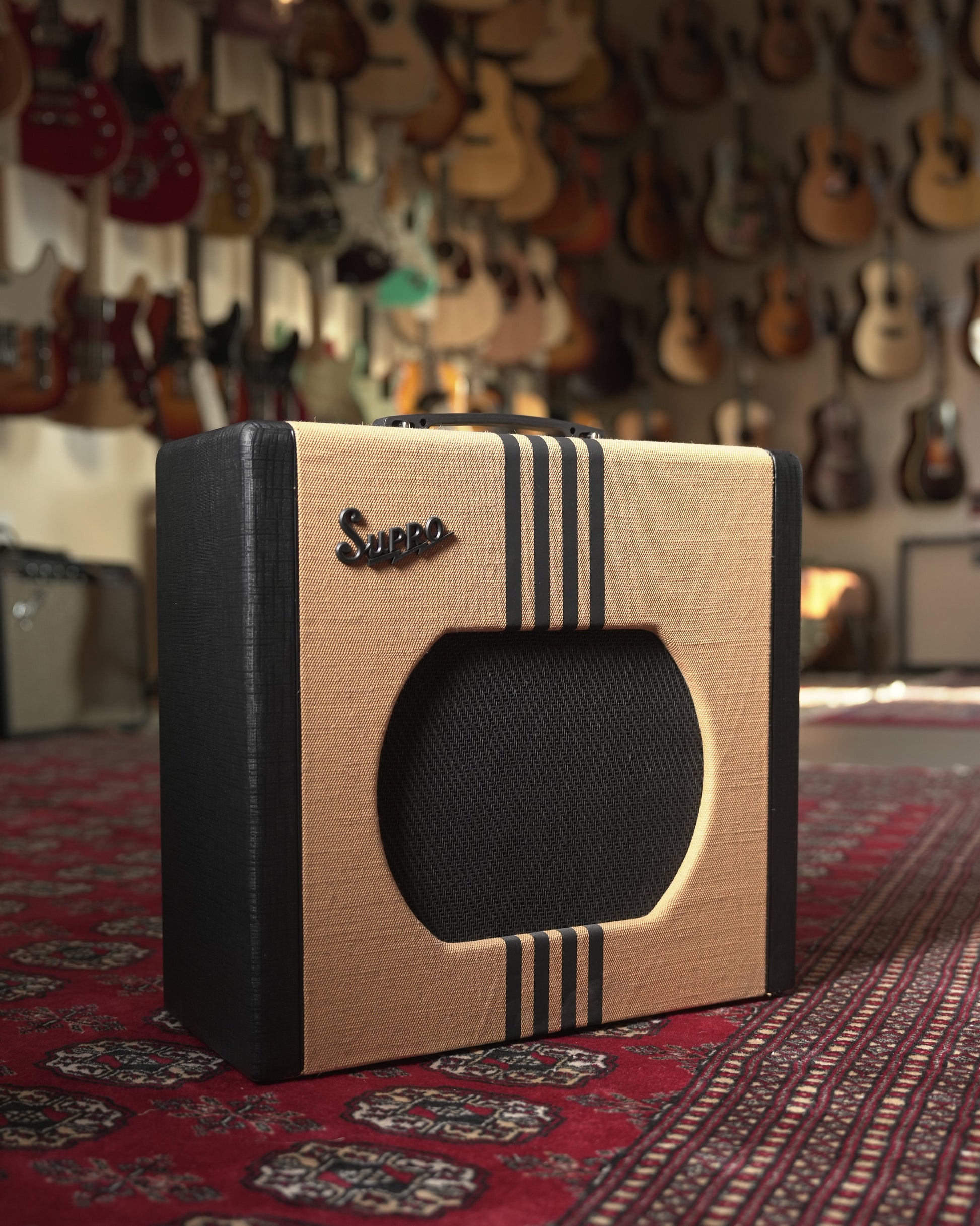 The Delta King 12 utilizes a 12AX7 tube preamp and a Class A 6L6 power amp to produce a pristine 1950s Supro sound, achieved by amplifying and sending the audio through a pure, unobstructed path.