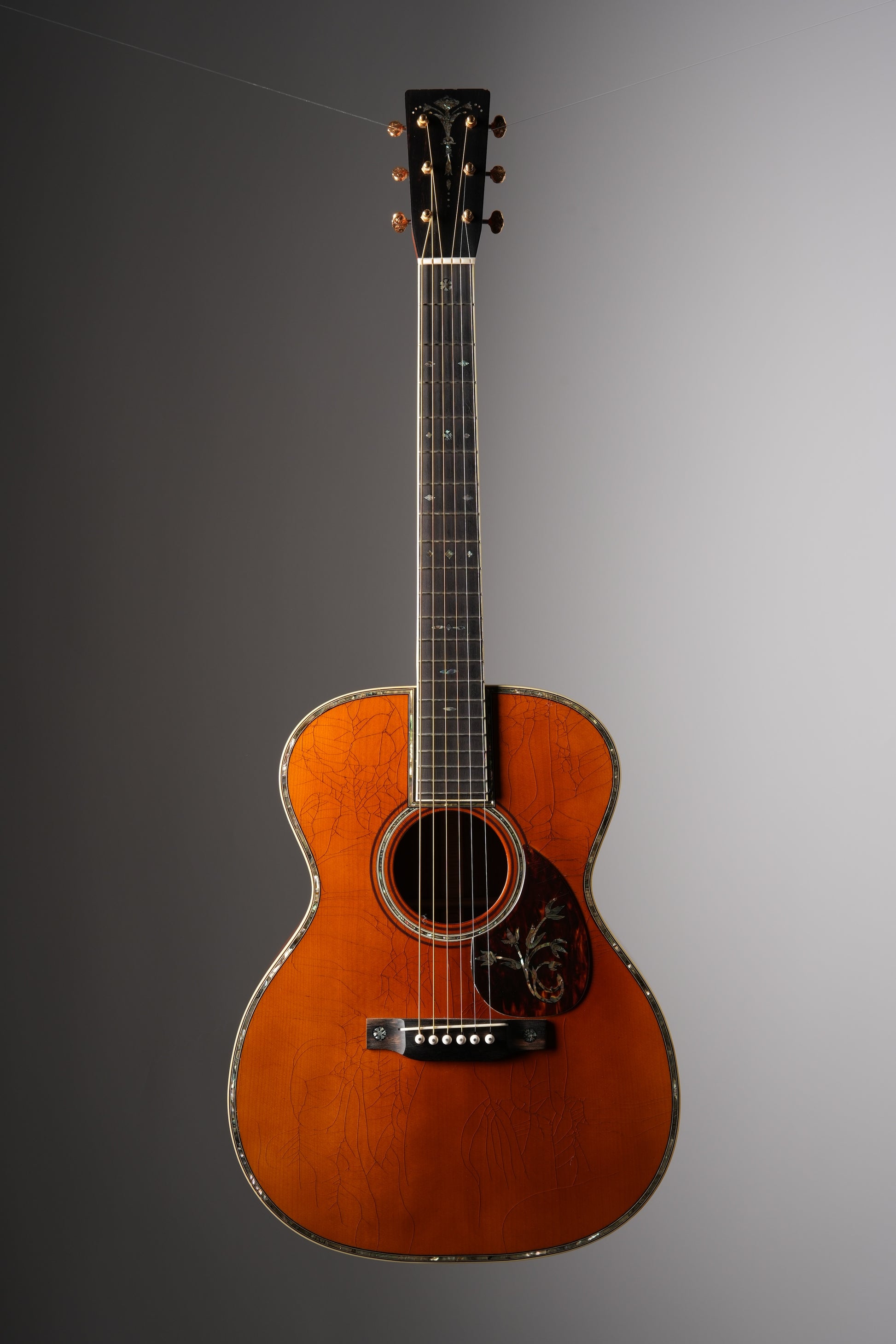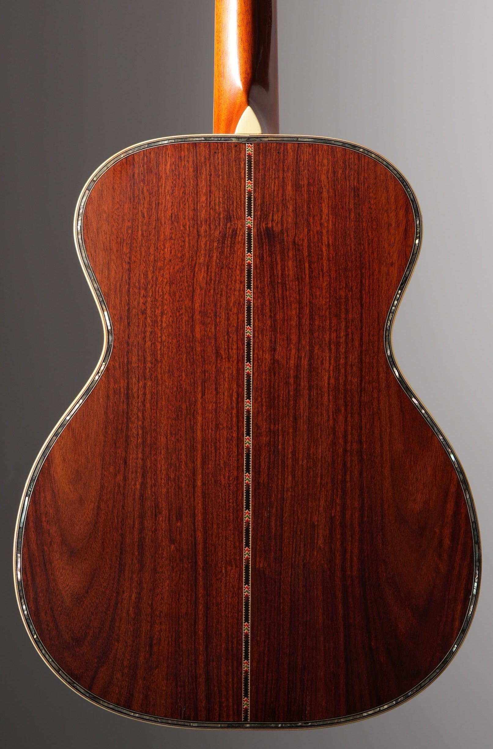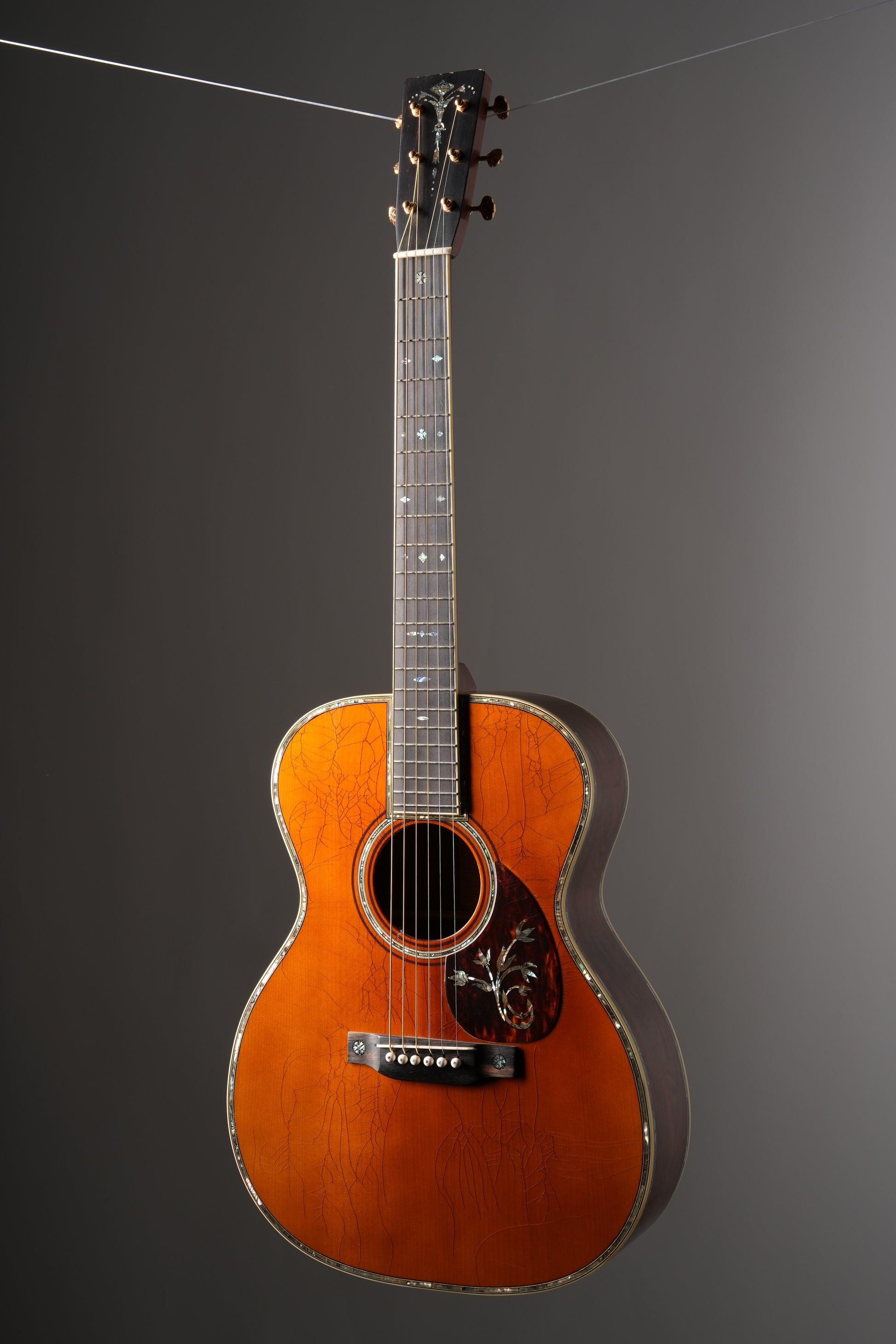 Crafted by Joel Whitehead, a long-time repairman for Norm's Rare Guitars who now operates his own full-time repair and building shop in Woodland Hills, CA. This guitar pays tribute to Martin's most prestigious model, the 1930 OM-45 Deluxe, of which only 12 were produced. Its features include abalone purflings at every joint, a pearl flower inlaid on the pickguard, abalone snowflakes on the bridge wings, a long scale, a 1 ¾" nut width, and a 15" 000 body.