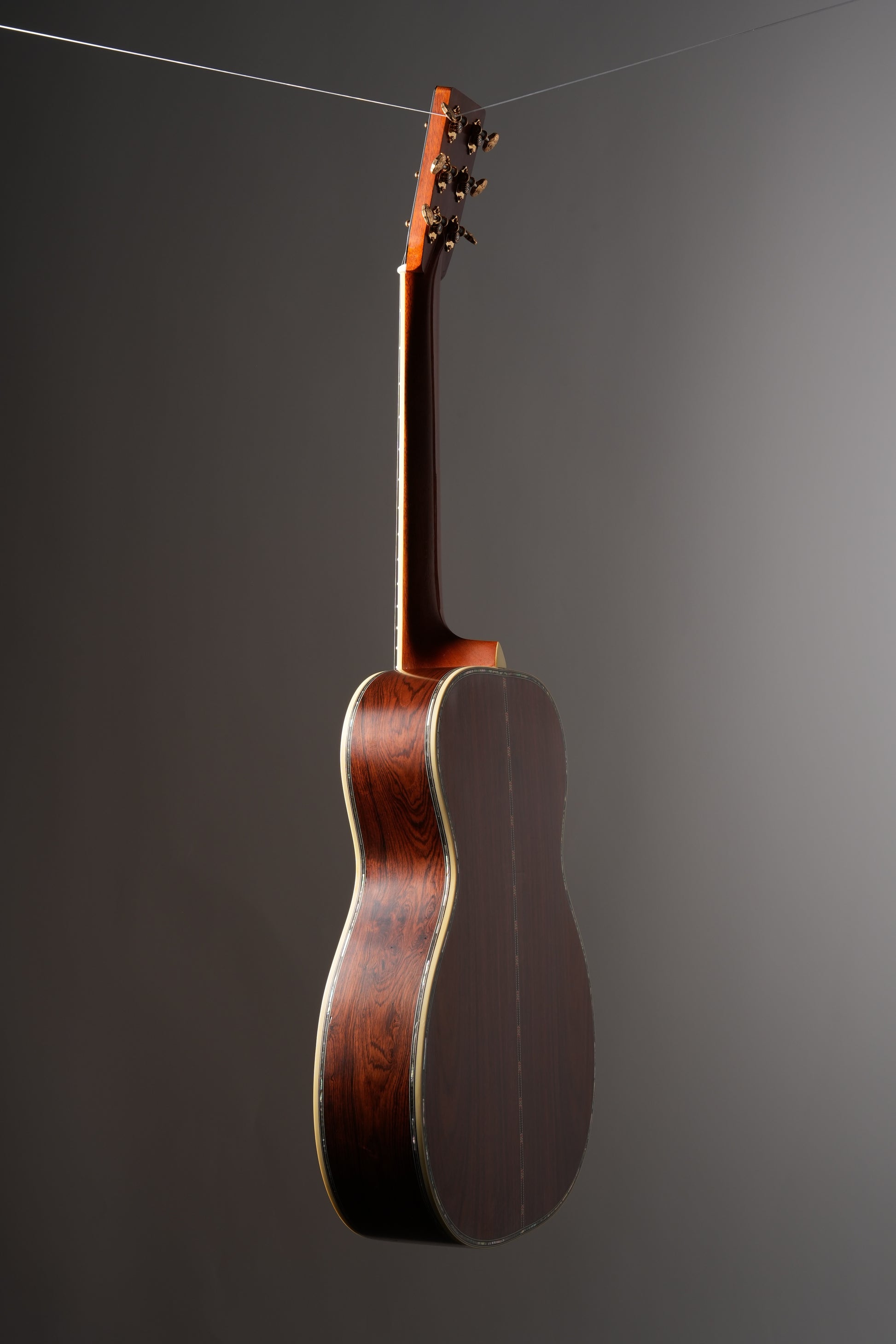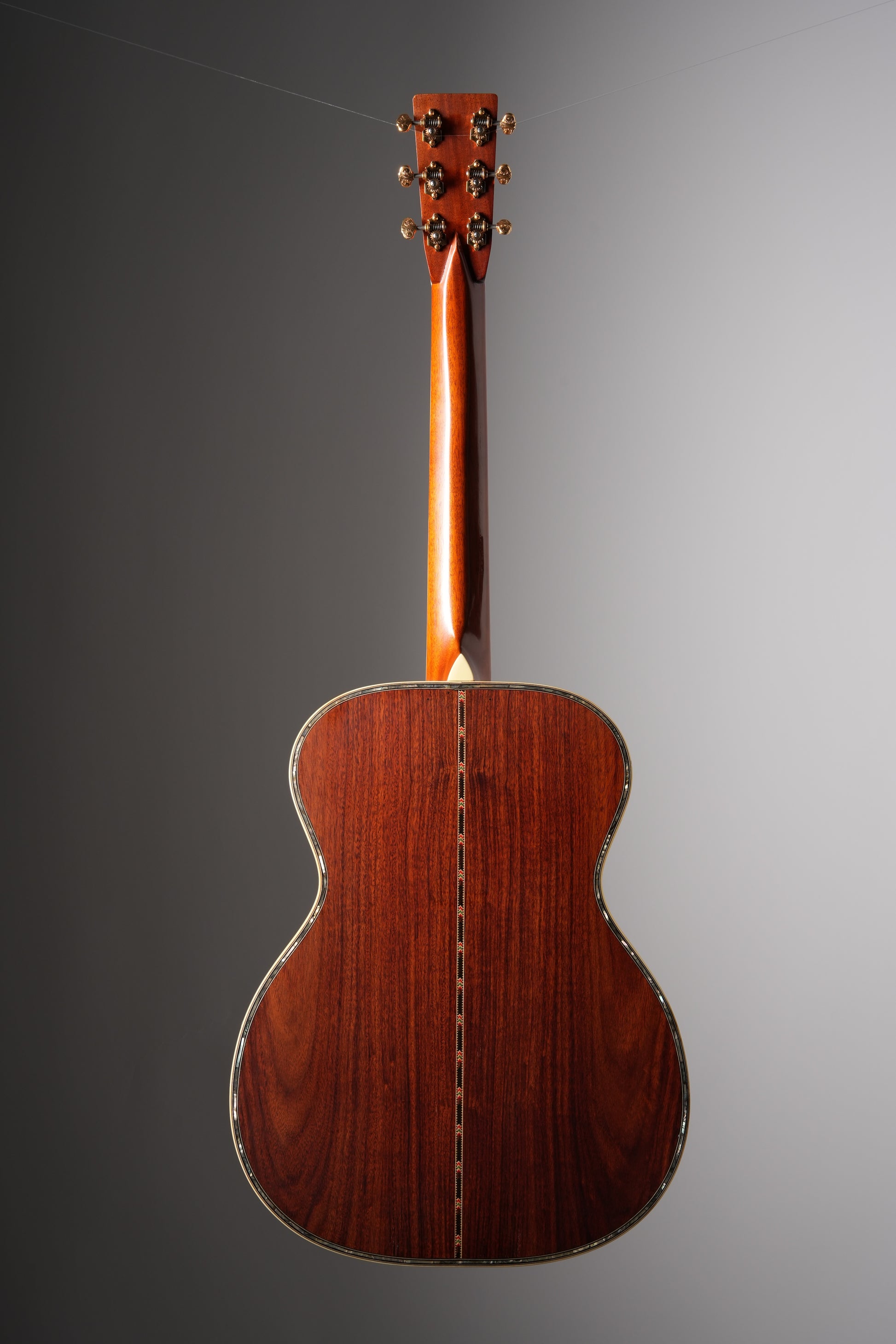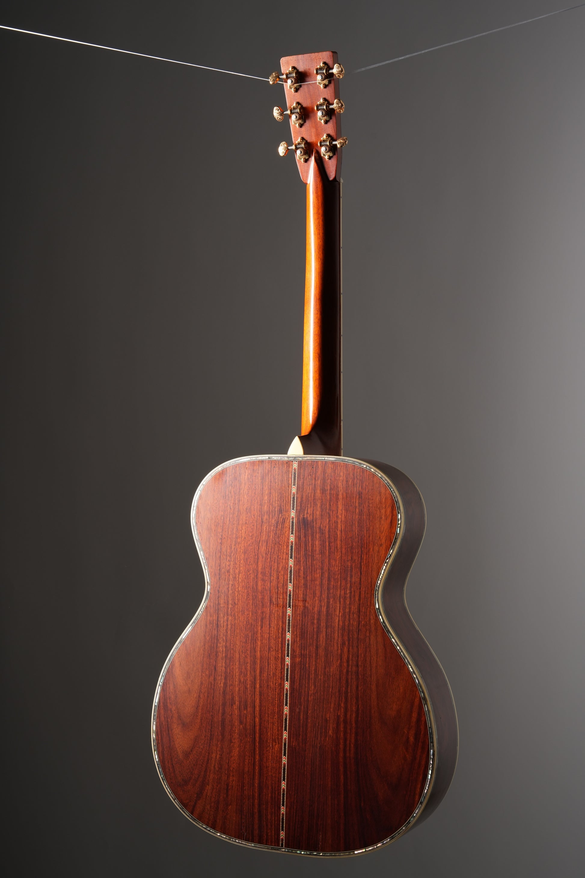 Crafted by Joel Whitehead, a long-time repairman for Norm's Rare Guitars who now operates his own full-time repair and building shop in Woodland Hills, CA. This guitar pays tribute to Martin's most prestigious model, the 1930 OM-45 Deluxe, of which only 12 were produced. Its features include abalone purflings at every joint, a pearl flower inlaid on the pickguard, abalone snowflakes on the bridge wings, a long scale, a 1 ¾" nut width, and a 15" 000 body.